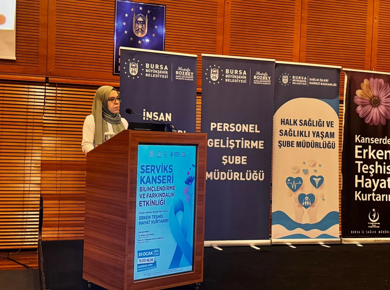 Ocak ayının Serviks Kanseri Farkındalık Ayı olarak kabul edilmesi kapsamında, Bursa Büyükşehir Belediyesi tarafından kadın çalışanlara yönelik ‘Serviks Kanseri Bilinçlendirme ve Farkındalık Etkinliği’ düzenlendi. İnsan Kaynakları ve Eğitim Dairesi Başkanlığı ile Sağlık İşleri Dairesi Başkanlığı iş birliğinde, İl Sağlık Müdürlüğü’nün desteğiyle gerçekleştirilen program, Atatürk Kültür Merkezi Merinos Yerleşkesi’nde yapıldı.