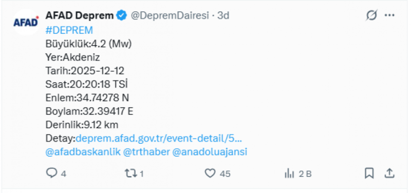 <div>Karadeniz'de gerçekleşen sarsıntının ardından AFAD tarafından Akdeniz'de de bir depremin meydana geldiği açıklandı...</div> <div>AFAD açıklamasına göre Karadeniz'de meydana gelen 4.1'lik sarsıntının ardından bir deprem de Akdeniz'de meydana geldi.</div> <div>Akdeniz açıklarında meydana gelen 4.2 büyüklüğündeki deprem de kıyı illerimizde hissedildi.</div> <div></div>