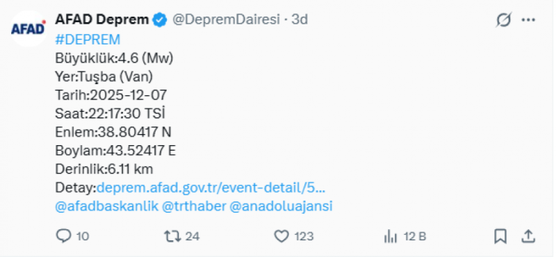 <div>AFAD açıklamasına göre Van'da meydana gelen deprem il genelinde hissedildi.</div> <div>AFAD açıklamasına göre Van Tuşba'da akşam saatlerinde 4.6 büyüklüğünde bir deprem meydana geldi. </div> <div>Depremin il genelinde hissedildiği açıklandı.</div> <div>22.17'de meydana gelen depremin yerin 6.11 kilometre altında meydana geldiği bilgisi paylaşıldı.</div> <div></div>
