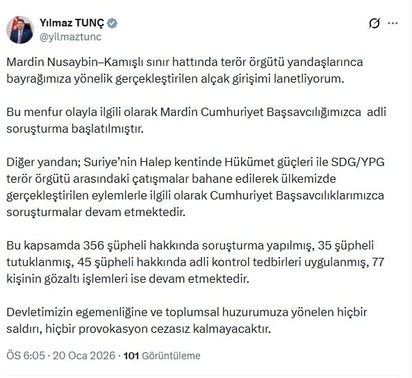 <div>Adalet Bakanı Yılmaz Tunç, sanal medya hesabından yaptığı açıklamada, "Mardin Nusaybin–Kamışlı sınır hattında terör örgütü yandaşlarınca bayrağımıza yönelik gerçekleştirilen alçak girişimi lanetliyorum. Bu menfur olayla ilgili olarak Mardin Cumhuriyet Başsavcılığımızca adli soruşturma başlatılmıştır" dedi.</div> <h3>'35 ŞÜPHELİ TUTUKLANDI'</h3> <div>Tunç, Suriye’nin Halep kentinde hükümet güçleri ile SDG/YPG terör örgütü arasındaki çatışmalar bahane edilerek Türkiye'de gerçekleştirilen eylemlerle ilgili de soruşturmaların devam ettiğini bildirerek, "Bu kapsamda 356 şüpheli hakkında soruşturma yapılmış, 35 şüpheli tutuklanmış, 45 şüpheli hakkında adli kontrol tedbirleri uygulanmış, 77 kişinin gözaltı işlemleri ise devam etmektedir. Devletimizin egemenliğine ve toplumsal huzurumuza yönelen hiçbir saldırı, hiçbir provokasyon cezasız kalmayacaktır" ifadelerini kullandı.</div> <div></div> <div></div> <div></div> <div>(DHA)</div>