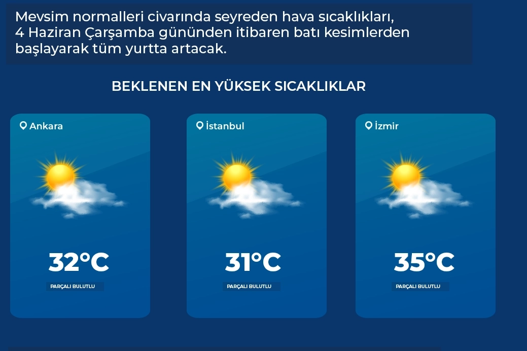 <div>Mevsim normalleri civarında seyreden hava sıcaklıklarının, yarından (çarşamba) itibaren batı kesimlerden başlayarak tüm yurtta artması bekleniyor. Bayram süresince sıcaklık mevsim normalleri üzerinde seyredecek.</div><div xss="removed">Çevre, Şehircilik ve İklim Değişikliği Bakanlığı’na bağlı Meteoroloji Genel Müdürlüğü, Kurban Bayramı’nın hava tahmin raporunu açıkladı. Mevsim normalleri civarında seyreden hava sıcaklıklarının, yarından itibaren batı kesimlerden başlayarak tüm yurtta artması, bayram süresince de mevsim normalleri üzerinde seyretmesi bekleniyor.</div> <div xss="removed"><strong>5 GÜNLÜK TAHMİN</strong></div> <div xss="removed">Hava tahmin raporuna göre; arefe günü (perşembe), Doğu Karadeniz’in iç kesimleri ile Ardahan çevresi, bayramın birinci günü ise Doğu Anadolu’nun doğusu sağanak ve gök gürültülü sağanak yağışlı, diğer yerler parçalı az bulutlu geçecek. Bayramın ikinci günü ülke genelinde yağış beklenmiyor. Bayramın üçüncü günü Hakkari ve Van çevreleri ile Batı Akdeniz’in iç kesimlerinde yağış görülebilir. Bayramın dördüncü günü ise Doğu Anadolu’nun kuzey ve doğusunda sağanak ve gök gürültülü sağanak bekleniyor.</div> <div xss="removed"><strong>BEKLENEN EN YÜKSEK SICAKLIKLAR</strong></div> <div xss="removed">5-9 Haziran 2025 tarihleri arasında 3 büyük ilde tahmin edilen en yüksek hava sıcaklıkları şöyle olacak; Ankara: 32 derece / İstanbul: 31 derece / İzmir: 35 derece.</div> <div></div>