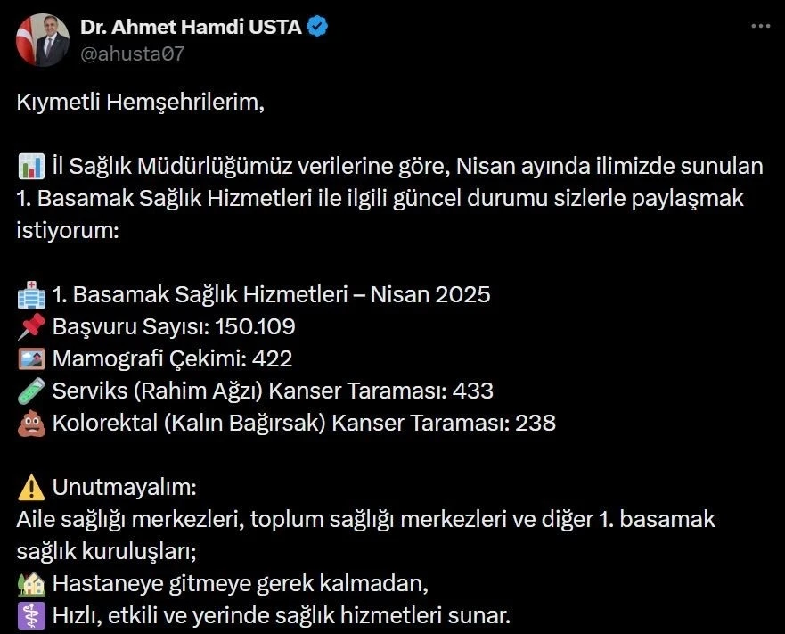 Bingöl’de İl Sağlık Müdürlüğü tarafından yapılan çalışmalarda bin 93 kişinin kanser taraması yapıldı. Bingöl Valisi Dr. Hamdi Usta, İl Sağlık Müdürlüğü verilerini paylaştı. Verilere göre Nisan ayında kentte sunulan 1. Basamak Sağlık Hizmetlerine 150 bin 109 başvuru alındı. Başvurulardan bin 93 kişinin kanser taraması yapıldığı bildirildi. Vali Usta açıklamasında, "Unutmayalım, aile sağlığı merkezleri, toplum sağlığı merkezleri ve diğer 1. basamak sağlık kuruluşları; hastaneye gitmeye gerek kalmadan, hızlı, etkili ve yerinde sağlık hizmetleri sunar. Sağlık sisteminin yükünü azaltmak ve hizmetlere daha hızlı ulaşmak için rutin kontrollerinizde mutlaka 1. Basamak Sağlık Hizmetlerini tercih edin" ifadelerini kullandı.