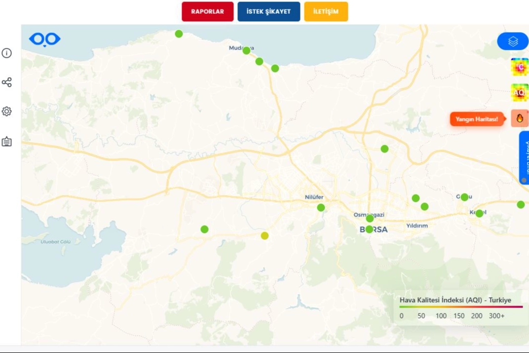 Bursa Büyükşehir Belediyesi, hava ve gürültü kirliliğinin tespiti için geçtiğimiz aylarda devreye aldığı hava kalitesi izleme sistemine yangın izleme sistemini de entegre etti. Bursa’daki ve Türkiye’deki tüm yangın noktalarını anlık olarak gösteren sistemi, Büyükşehir Belediyesi’nin internet sitesi üzerinden herkes kullanabilecek.Bursa Büyükşehir Belediyesi, hava ve gürültü kirliliğinin tespiti için geçtiğimiz aylarda devreye aldığı hava kalitesi izleme sistemine yangın izleme sistemini de entegre etti. Bursa’daki ve Türkiye’deki tüm yangın noktalarını anlık olarak gösteren sistemi, Büyükşehir Belediyesi’nin internet sitesi üzerinden herkes kullanabilecek. Çevresel gürültü ölçümleri yapılıyor Bursa’nın daha sağlıklı ve daha yeşil olması için çalışmalarını aralıksız sürdüren Büyükşehir Belediyesi; havası ve suyu temiz bir kent için teknoloji kullanmaya devam ediyor. Geçtiğimiz aylarda hava kirliliği parametrelerinin ve gürültü kirliliğinin tespitine yönelik mobil izleme ağı oluşturan ve mobil ekiplerle 14 ilçede çevresel gürültü ölçümleri yapan Büyükşehir Belediyesi, hava kalitesi izleme sistemine yangın izleme sistemini de entegre etti. Anlık takip edilebilecek Çevre Koruma ve Kontrol Dairesi Başkanlığı tarafından geliştirilen sistemle, Bursa’daki ve Türkiye’deki tüm yangın noktaları online izlenebilecek. Büyükşehir Belediyesine ait https://www.bursa.bel.tr/hava-kalitesi adresine girenler, ateş ikonuna tıklayarak yangın noktalarını anlık görüntüleyebilecek. Yangın izleme sistemi devrede Bursa Büyükşehir Belediye Başkanı Mustafa Bozbey, kentin hava ve gürültü kirliliği haritasını oluşturmak adına geçtiğimiz aylarda hizmete alınan hava kalitesi izleme sistemine yangın izleme sistemini de dahil ettiklerini söyledi. Bursa’nın son yılların en büyük yangın felaketini yaşadığını hatırlatan Başkan Bozbey, yeni sistemle yangınların hızlı tespit edilip verilerin paylaşılacağını ve böylelikle daha hızlı bir koordinasyon sağlanabileceğini ifade etti.