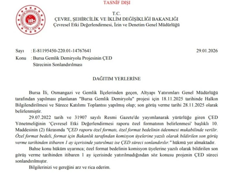 <div>Bursa ile Gemlik limanlarını birbirine bağlayarak lojistik maliyetlerini düşürmeyi hedefleyen stratejik demiryolu projesinde çarpıcı bir gelişme yaşandı. Yıllık 30 milyon ton taşıma kapasitesine sahip olması planlanan ve ÇED süreci başlatılan projede, yönetmelik hükümlerine takılan bir gecikme nedeniyle süreç tamamen durduruldu.</div> <h3>YASAL SÜREDE ÖDENMEDİ</h3> <div>2 milyar 865 milyon TL maliyetle Osmangazi ve Gemlik ilçeleri arasından geçmesi planlanan proje için 18 Kasım 2025'te Halkın Katılımı Toplantısı yapılmıştı. Ancak ÇED Yönetmeliği'nin 10. maddesi uyarınca yatırılması gereken "özel format bedeli", yasal süresi içinde ödenmedi. Çevre, Şehircilik ve İklim Değişikliği Bakanlığı'ndan yapılan açıklamada, son görüş verme tarihi olan 28 Kasım 2025'ten itibaren 1 ay içinde ödenmesi gereken bedelin yatırılmadığı, bu nedenle projenin ÇED sürecinin yönetmelik gereği resmen sonlandırıldığı belirtildi.</div> <div></div>