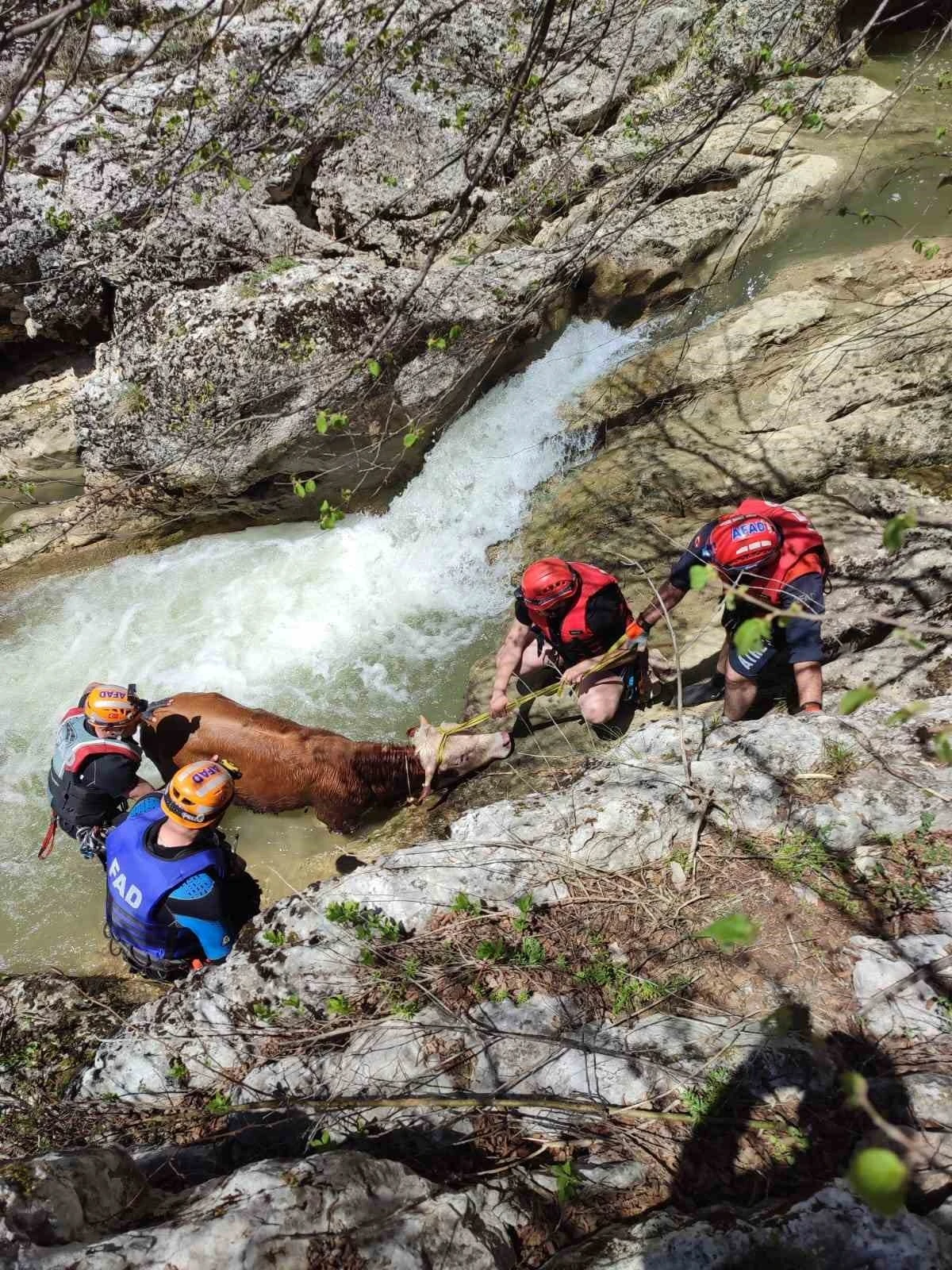 Kastamonu’nun Ağlı ilçesinde kayalıklardan dere yatağına yuvarlanan dana, AFAD ekiplerince kurtarıldı. Edinilen bilgiye göre Selmanlı Mahallesi’nde kayalıklardan yuvarlanan dana dere yatağında mahsur kaldı. Köylülerin uğraşlarıyla bulunduğu yerden çıkartılamayan büyükbaş hayvan için 112 Acil Çağrı Merkezi’nden yardım istendi. İhbarla bölgeye giden İl Afet ve Acil Durum Müdürlüğü (AFAD) ekipleri, mahsur kalan hayvanı ip yardımıyla mahsur kaldığı alandan çıkarıp sahibine teslim etti.