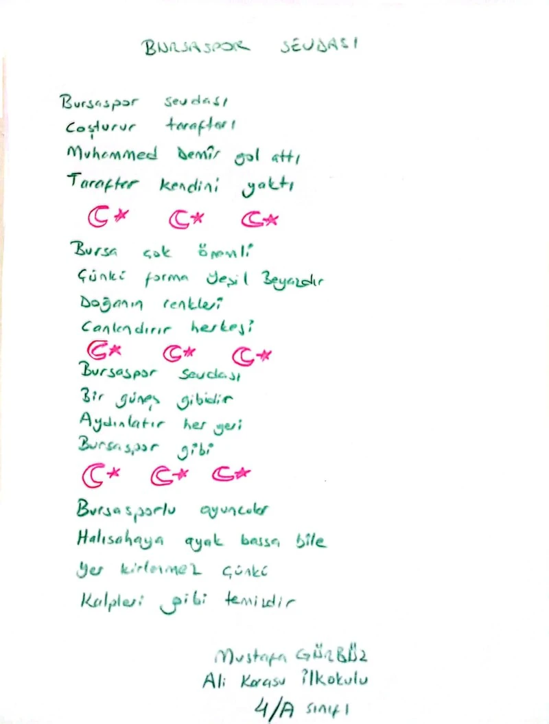 <div>Ali Karasu İlkokulu 4/A sınıfı öğrencisi Mustafa Gürbüz’ün yazdığı “Bursaspor Sevdası” adlı şiir, sınıf öğretmenleri ve arkadaşları tarafından büyük beğeni topladı.</div> <div></div> <div>Henüz ilkokul çağında olmasına rağmen Bursaspor aşkını duygu dolu dizelerle ifade eden Mustafa Gürbüz, yeşil-beyaz sevdayı çocuk gözüyle, samimi ve içten bir anlatımla kaleme aldı. </div> <div>Şiirde Bursaspor’un taraftar coşkusu, kulüp renklerinin doğayla olan uyumu ve futbolcuların temiz yüreği vurgulandı.</div> <div></div> <div>“<strong>BURSASPOR SEVDASI</strong></div> <div><strong>Bursaspor sevdası</strong></div> <div><strong>Coşturur taraftarı</strong></div> <div><strong>Muhammed Demir gol attı </strong></div> <div><strong>Taraftar kendini yaktı</strong></div> <div></div> <div><strong>Bursa çok önemli</strong></div> <div><strong>Çünkü forma yeşil beyazdır </strong></div> <div><strong>Doğanın renkleri </strong></div> <div><strong>Canlandırır herkesi </strong></div> <div></div> <div><strong>Bursaspor sevdası </strong></div> <div><strong>Bir güneş gibidir</strong></div> <div><strong>Aydınlatır her yeri </strong></div> <div><strong>Bursaspor gibi</strong></div> <div></div> <div><strong>Bursasporlu oyuncular</strong></div> <div><strong>Halı sahaya ayak bassa bile </strong></div> <div><strong>Yer kirlenmez çünkü </strong></div> <div><strong>Kalpleri gibi temizdir </strong></div> <div></div> <div><strong>Mustafa GÜRBÜZ </strong></div> <div><strong>Ali Karasu ilkokulu </strong></div> <div><strong>4/A sınıfı"</strong></div> <div></div> <div>Öğrencinin yazdığı şiir, Ali Karasu İlkokulu 4/A sınıfında öğretmenleri tarafından da takdirle karşılandı. Sınıf öğretmenleri, öğrencilerinin küçük yaşta hem edebiyata hem de kentin ortak değerlerine ilgi duymasının sevindirici olduğunu ifade etti.</div> <div></div> <div>Bursaspor’un sadece bir spor kulübü değil, aynı zamanda Bursa’nın ortak değeri ve kuşakları birleştiren bir sevda olduğuna dikkat çeken şiir, okuyan herkese tebessüm ettirdi.</div> <div></div> <div>Eğitimciler, bu tür çalışmaların çocukların kendilerini ifade etme becerilerini geliştirdiğini ve aidiyet duygusunu güçlendirdiğini vurgulayarak, Mustafa Gürbüz’ü ve emeği geçen öğretmenlerini tebrik etti.</div> <div></div>