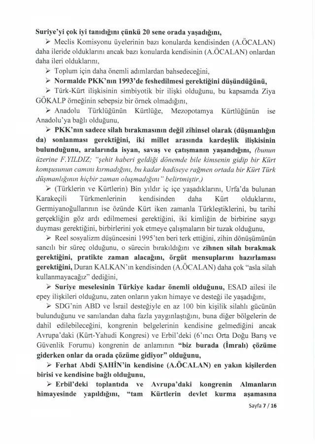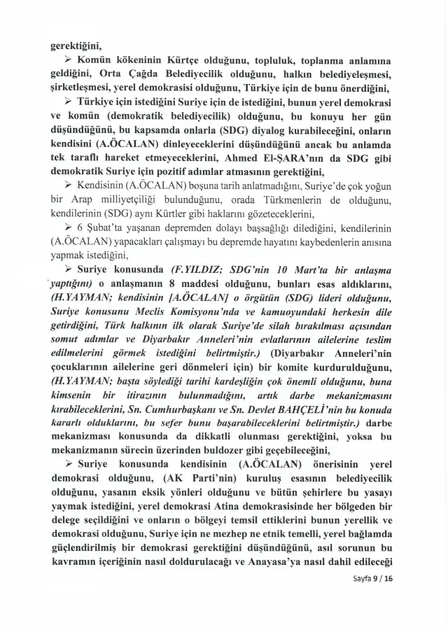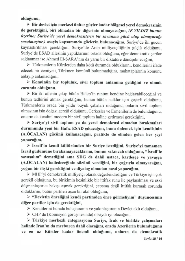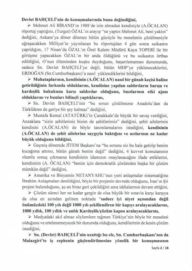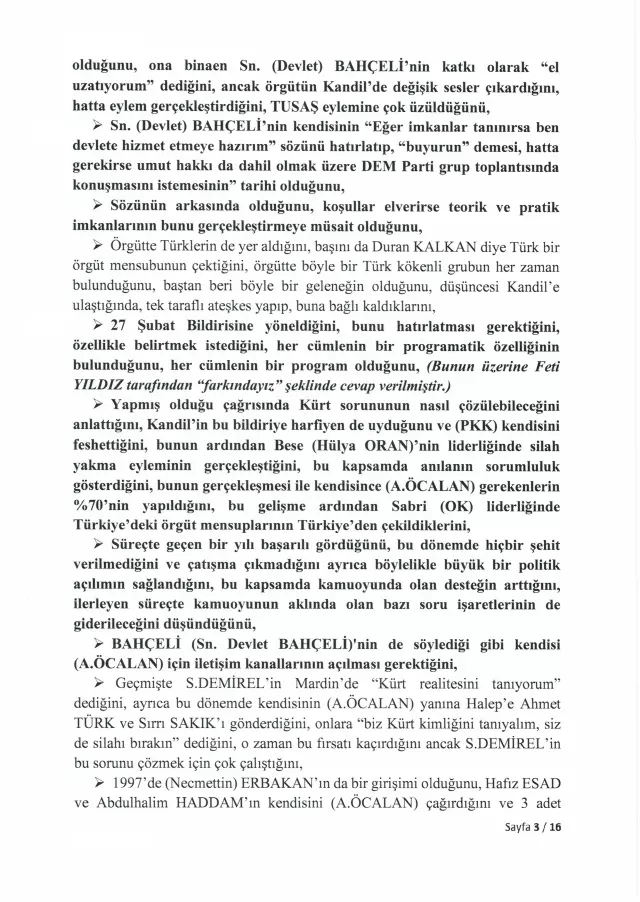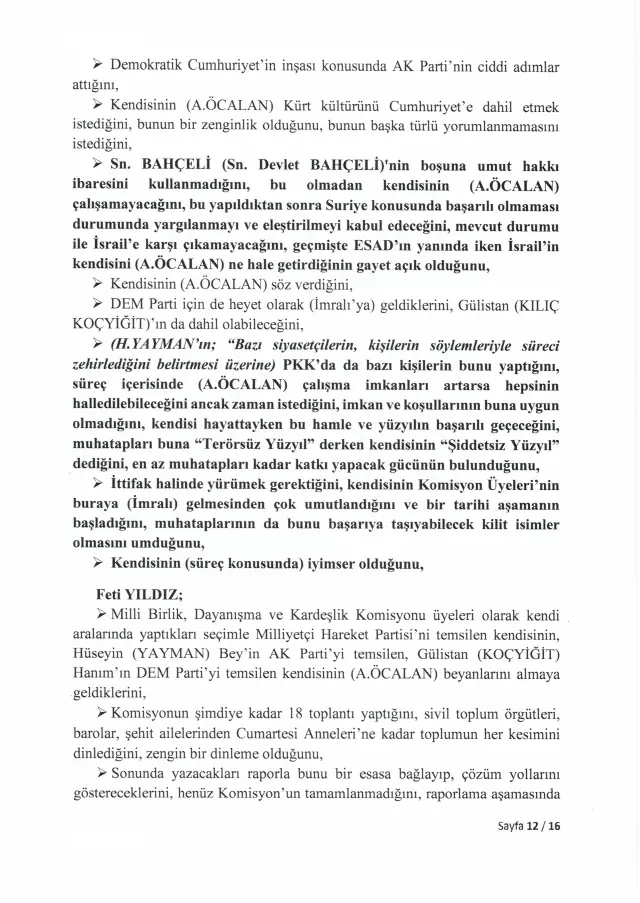 <div>Türkiye Büyük Millet Meclisi, 24 Kasım 2025'te İmralı Adası'nda gerçekleştirilen görüşmenin tam tutanaklarını yayımladı. Meclis Milli Dayanışma, Kardeşlik ve Demokrasi Komisyonu adına yapılan görüşmeye ilişkin kayıtlar, "İmralı Yüksek Güvenlikli Cezaevi Görüşme Tutanağı" başlığıyla TBMM'nin resmi internet sitesinde yer aldı.</div> <h3>ÜÇ PARTİDEN ÜÇ MİLLETVEKİLİ KATILMIŞTI</h3> <div>İmralı Adası'nda gerçekleştirilen görüşmeye AK Parti Genel Başkan Yardımcısı Hüseyin Yayman, DEM Parti Grup Başkanvekili Gülistan Kılıç Koçyiğit ve MHP Genel Başkan Yardımcısı Feti Yıldız katıldı. Heyet, Milli Dayanışma, Kardeşlik ve Demokrasi Komisyonu'nu temsilen PKK lideri Abdullah Öcalan ile görüşme gerçekleştirdi.</div> <h3>ÖZET TUTANAKLAR TEPKİ ÇEKMİŞTİ</h3> <div>Görüşmenin ardından hazırlanan özet tutanaklar, 4 Aralık 2025'te yapılan komisyon toplantısında okunmuştu. Ancak tutanakların yalnızca özet halinde paylaşılması, başta DEM Parti olmak üzere muhalefet partilerinin tepkisini çekmişti. Muhalefet, görüşmenin içeriğinin eksiksiz şekilde kamuoyuyla paylaşılması gerektiğini savunmuştu.</div> <h3>İKİ AY SONRA TAM METİN YAYIMLANDI</h3> <div>Meclis Başkanı Numan Kurtulmuş, o dönemde tutanakların tamamının açıklanmasına yönelik bir adım atmamıştı. Aradan geçen yaklaşık iki ayın ardından TBMM, görüşmenin tam metnini yayımlama kararı aldı.</div> <h3>ÖCALAN'DAN "ÜLKÜ OCAĞI" ÇIKIŞI</h3> <div>Yayımlanan tutanaklarda Abdullah Öcalan, Kürt sorununun bin yıllık bir sorun olduğunu ve üç aşamadan oluştuğunu ifade etti. Öcalan, sürecin değerlendirilmesinde konjonktürel gelişmelerin dikkate alınması gerektiğini dile getirdi. Tutanaklarda ayrıca Öcalan'ın, siyasete ilk adımını Ülkü Ocağı'nda attığını söylediği ifadeler de yer aldı.</div> <h3>"UMUT HAKKI OLMADAN..."</h3> <div>Tutanaklara göre Öcalan, "Bahçeli'nin boşuna umut hakkını ibaresini kullanmadığını, bu olmadan kendisinin çalışamayacağını, bu yapıldıktan sonra Suriye konusunda başarılı olmaması durumunda yargılanmayı ve eleştirilmeyi kabul edeceğini" belirtti.</div> <h3>SÜRECİ "ŞİDDETSİZ YÜZYIL" OLARAK NİTELENDİRDİ</h3> <div>Yayman'ın "Bazı siyasetçilerin, kişilerin söylemleriyle süreci zehirlediğini" belirtmesi üzerine Öcalan, "PKK'da da bazı kişilerin bunu yaptığını, süreç içerisinde çalışma imkanları artarsa hepsinin halledilebileceğini, imkan ve koşullarının buna uygun olmadığını, kendisi hayattayken bu hamle ve yüzyılın başarılı geçeceğini, muhatapları buna "Terörsüz Türkiye" derken kendisinin "Şiddetsiz Yüzyıl" dediğini, en az muhatapları kadar katkı yapacak gücünün bulunduğunu ve süreç konusunda iyimser olduğunu" iletti.</div> <h3>FETİ YILDIZ'DAN DİKKAT ÇEKEN SÖZLER</h3> <div>Tutanaklara yansıyan ifadelere göre MHP Genel Başkan Yardımcısı Feti Yıldız, Abdullah Öcalan'a hitaben yaptığı değerlendirmede, silahlı yöntemden siyasi yönteme geçildiğini, eşit yurttaşlık, kültürel adımlar ve komünalite başlıklarının öne çıktığını bildiklerini söyledi. Yıldız, Öcalan'ın Şubat 2025'te yaptığı çağrıda tüm yapıların silahlı mücadeleyi bırakması ve örgütsel varlıklarını dağıtması gerektiğinin anlaşıldığını, bu çağrının toplumu ciddi şekilde rahatlattığını ve halkın süreci yakından takip ettiğini ifade etti. MHP'nin "silah bırakma" çağrısının yalnızca Türkiye'yi değil, Suriye, Irak ve İran'daki yapıları da kapsamasının önemine dikkat çeken Yıldız, yaşanan sorunların demokrasi çerçevesinde çözülebileceğini ve bunun ancak teröre son verilerek, "Terörsüz Türkiye" hedefiyle mümkün olacağını vurguladı.</div> <div></div> <div></div> <div></div> <div></div> <div></div> <div></div> <div></div> <div></div> <div></div> <div></div> <div></div> <div></div> <div></div> <div></div> <div></div> <div></div> <div></div> <h3>https://www.turkhaber.com/haber/bursa-buyuksehir-in-ramazan-destegi-basladi-4132409.html</h3>