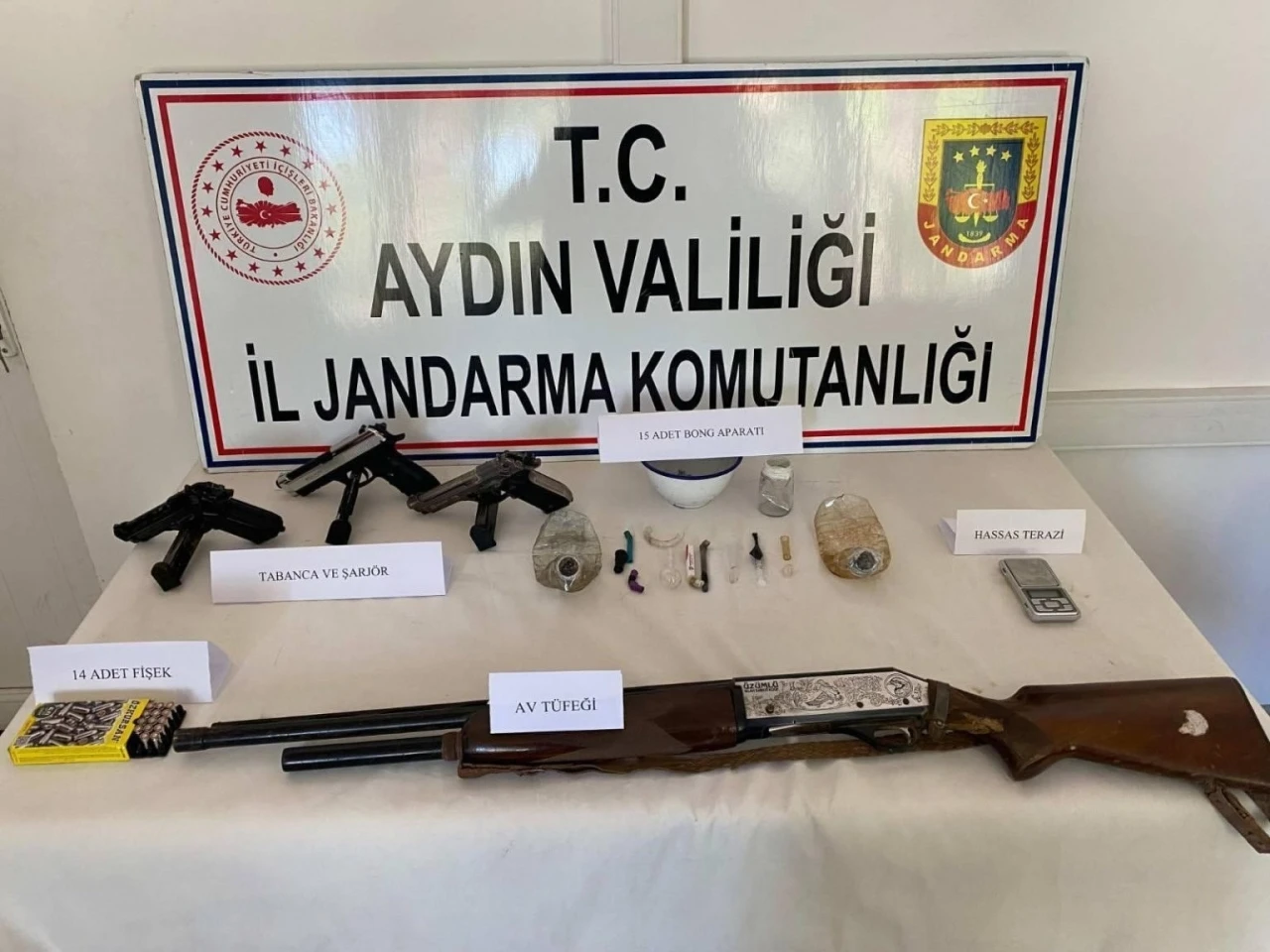 Aydın’ın Karacasu ilçesinde şüpheli şahsın evinde yapılan aramada uyuşturucu kullanma aparatları ve tabanca ele geçirildi. Aydın İl Jandarma Komutanlığı KOM Şube Müdürlüğü ve Karacasu İlçe Jandarma Komutanlığınca uyuşturucu madde imal ve ticaretine yönelik çalışma başlatıldı. Karacasu ilçesinde O.G. isimli şüpheli şahsın ikametinde ve eklentilerinde yapılan aramada, 15 Adet uyuşturucu kullanma aparatı, 1 Adet hassas terazi, 3 Adet tabanca ve tabancaya ait şarjör, 1 Adet av tüfeği, 14 Adet kurusıkı tabanca ele geçirildi. Yakalanan şüpheli hakkında adli sürecin devam ettiği öğrenildi.