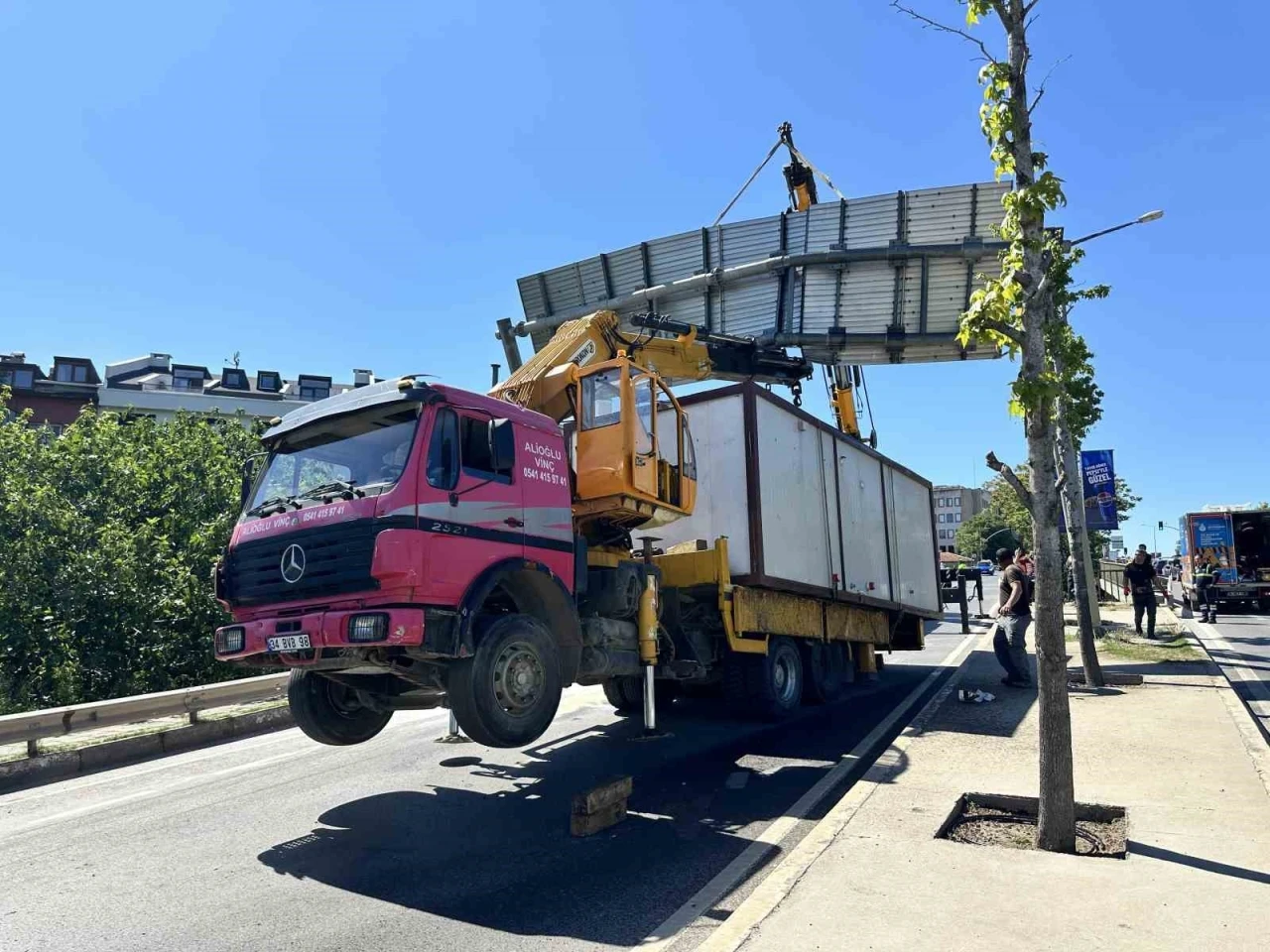 Kadıköy’de konteyner yüklü bir vincin bom kısmı seyir halindeyken baş üstü yönlendirme levhasına takıldı. Olayda yaralanan olmazken, levhada ve vinçte maddi hasar oluştu. Olay, Kadıköy Rasimpaşa Mahallesi Taşköprü Caddesi’nde meydana geldi. Kalamış istikametine seyir halinde olan 34 BVB 98 plakalı konteyner yüklü vincin bom kısmı baş üstü yönlendirme levhasına çarptı. Çarpmanın etkisiyle vinç adeta şaha kalktı. Kalamış yönü bir süre trafiğe kapandı. Durumun bildirilmesi üzerine olay yerine polis, zabıta ve belediye ekipleri sevk edildi. Polis ekipleri çevrede güvenlik önlemi alırken olay yerine çağrılan bir vinç ile takılı kalan vinç kurtarıldı. Zarar gören yön levhası ise belediye ekiplerinin çalışması sonucu kaldırıldı. Kaza ile ilgili inceleme başlatıldı.