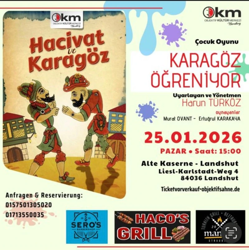 <div>Landshut ve çevresinde binlerce Türk vatandaşının yaşamasına rağmen, bugüne kadar çocuklara yönelik böylesine kapsamlı ve anlamlı bir kültürel etkinliğin ilk kez düzenleniyor olması, organizasyonu daha da kıymetli kılıyor.</div> <div></div> <div>Objektif Kültür Merkezi Nürnberg tarafından büyük bir özveriyle organize edilen ve çocuk oyunu olarak sahnelenecek olan “Karagöz Öğreniyor”, yalnızca bir tiyatro gösterisi olmanın ötesinde; kültürümüzü, değerlerimizi ve birlikte yaşama bilincini yeni kuşaklara aktaran güçlü bir kültür köprüsü niteliği taşıyor.</div> <div>Uyarlaması ve yönetmenliği Harun Türköz tarafından yapılan oyunda, Murat Ovant ve Ertuğrul Karakaya sahne alıyor. </div> <div>Etkinlik, 25 Ocak 2026 Pazar günü saat 15.00’te, Landshut’taki Alte Kaserne (Liesl-Karlstadt-Weg 4, 84036 Landshut) adresinde gerçekleştirilecek. Biletler ticketvorverkauf-objektifsahne.de üzerinden temin edilebiliyor.</div> <div></div> <div>1997 yılından bu yana Ertuğrul Bey ve yol arkadaşlarının çocuklara ve yetişkinlere yönelik sürdürdükleri bu kültürel yolculuk, “Onları bir an olsun mutlu edebiliyorsak, hayatlarına dokunup güldürebiliyorsak ne mutlu bize” anlayışıyla devam ediyor. </div> <div>Yıllardır sahnelenen Karagöz oyunları, hem geleneksel mizahı yaşatıyor hem de çocuklara doğruyu, yanlışı, birlikte yaşamanın önemini eğlenceli bir dille aktarıyor.</div> <div>Bu etkinlik, çocuklarımızın geleceğini güçlendirmenin yolunun; sevgiye, saygıya, eğitime, kültürel çalışmalara, sanata, spora ve karşılıklı diyaloğa adanan emek, zaman ve sabırdan geçtiğini bir kez daha hatırlatıyor. Çünkü çocuklarımıza yalnızca bir gelecek değil, üzerine “sevgi”, “saygı” ve “umut” yazabilecekleri bir dünya bırakmak hepimizin ortak sorumluluğu.</div>