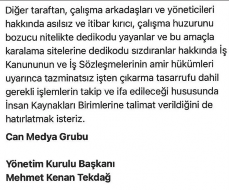 <div>Habertürk Genel Yayın Yönetmeni Mehmet Akif Ersoy'un tutuklandığı uyuşturucu soruşturması medya dünyasında depreme yol açtı. Taciz iddiaları ise gündeme bomba gibi düştü. Kadın spikerlerin bu konudaki şikayetlerini hem İnsan Kaynakları birimine hem de yönetici Kenan Tekdağ'a ilettiği öğrenildi. Ancak Tekdağ'ın kurum içinde tehdit içerikli bir mesaj göndererek taciz iddialarını örtbas etmeye çalıştığı öne sürüldü. </div> <div>Ünlülere yönelik uyuşturucu soruşturması gazetecilere sıçradı. Soruşturma kapsamında geçen hafta aralarında Habertürk Genel Yayın Yönetmeni Mehmet Akif Ersoy'un da olduğu bazı isimler tutuklandı. Habertürk'ün başındaki TMSF yönetimi Ersoy'u görevden aldı. Soruşturmada adı geçen kanalın spikerlerinden Ela Rümeysa Cebeci ile de yollar ayrıldı.</div> <div>Gündeme bomba gibi düşen soruşturmaya dair ayrıntılar gün yüzünde çıkarken, Mehmet Akif Ersoy ile ilgili ortaya atılan taciz iddialarının daha önce de kurum içi yapılan şikayetler üzerine gündeme geldiği ortaya çıktı.</div> <div></div> <h3>SPİKERLERDEN TACİZ ŞİKAYETİ</h3> <div>Sabah gazetesinde yer alan habere göre; kanaldaki bazı spikerler taciz edildikleri yönündeki iddiaları Habertürk'ün İnsan Kaynakları Birimi'ne iletti ancak gerekli desteği ve karşılığı göremedi.</div> <h3>EN TEPEYE KADAR ÇIKTILAR</h3> <div>Spikerler daha sonra durumu, o dönem Can Medya Grubu'nun Yönetim Kurulu Başkanı olan ve Can Holding soruşturmasında tutuklanan Mehmet Kenan Tekdağ'a ilettikleri belirtildi.</div> <h3>KENAN TEKDAĞ'DAN İDDİALARA KARARTMA</h3> <div>Bunun üzerine, 6 Ağustos 2025'te kurum içinde Kenan Tekdağ imzalı bir duyuru yapıldığı kaydedildi. Duyuruda, Ersoy hakkında ortaya atılan iddiaların "uydurma ve karalama amaçlı dedikodular" olduğu belirtilerek, Ersoy'un görevden alınacağı yönündeki söylentilerin de asılsız olduğu ifade ediliyor.</div> <h3>İŞTEN ÇIKARMA TEHDİDİ</h3> <div>Açıklamada, iddiaların araştıracağına dair herhangi bir inceleme veya denetim sürecine yer verilmezken, aksine bu konuları gündeme getirenler için "tazminatsız işten çıkarma dahil gerekli işlemlerin yapılacağı" kaydediliyor.</div> <h3>GÖZDAĞI VEREREK ÖRTBAS</h3> <div>Uyuşturucu soruşturmasında tutuklanan Habertürk eski Genel Yayın Yönetmeni Mehmet Akif Ersoy'a yönelik iddiaların, daha önceden Kenan Tekdağ tarafından bilindiği iddia edildi. Ancak olayın üzerini yapılan kurum içi duyuru ile çalışanlara gözdağı vererek kapatmaya çalıştığı öne sürüldü.</div> <div></div> <div>SABAH</div>