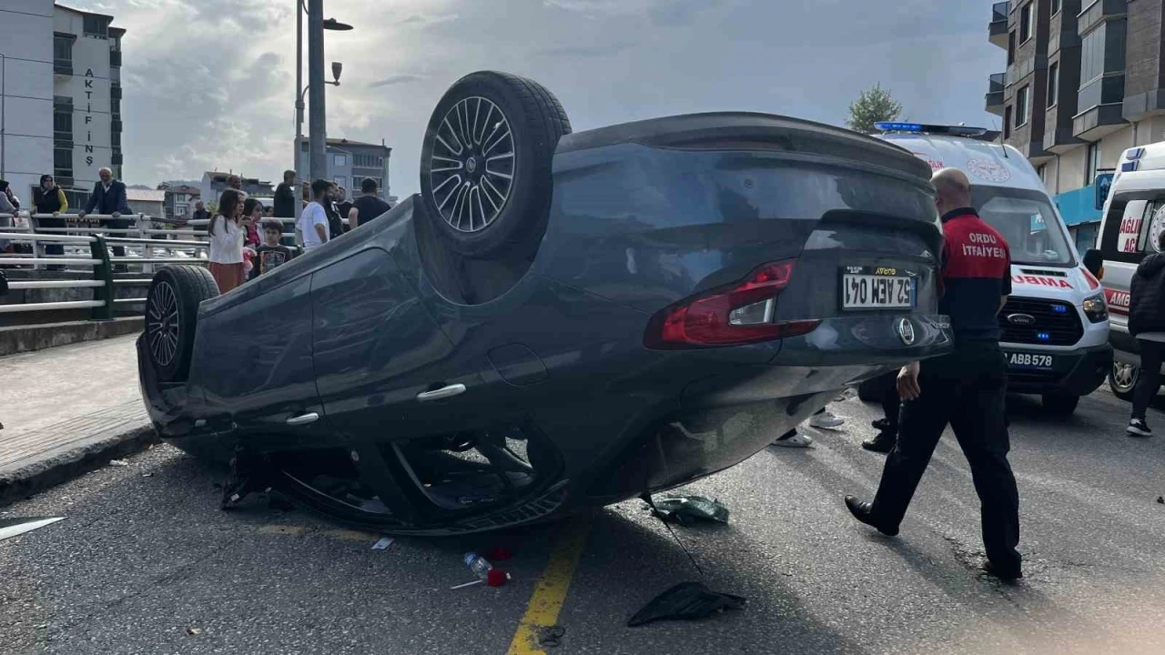 Ordu’nun Ünye ilçesinde iki otomobilin çarpıştığı kazada araçlardan biri takla attı. Kazada 5 kişi yaralandı. Kaza, Liseler Mahallesi Değirmen Yolu Sokak üzerinde meydana geldi. Edinilen bilgiye göre, Irmak Caddesi üzerinde seyir halinde ilerlemekte olan Ayten K. idaresindeki 52 AEM 041 plakalı otomobil, Değirmen Yolu Sokak üzerinde seyir halinde ilerlediği sırada önündeki aracı sollamaya çalışan Emrullah K. idaresindeki 52 AAF 858 plakalı otomobille çarpıştı. Çarpışmanın etkisiyle sürücüsünün kontrolünden çıkan 52 AEM 041, takla atarak ters döndü. Kazayı gören çevredekilerin 112 Acil Çağrı Merkezine ihbarı üzerine bölgeye sağlık, polis ve Ordu Büyükşehir Belediyesi Ünye İtfaiye Amirliğine bağlı ekipler sevk edildi. Kazada otomobil sürücüsü Ayten K. ve yanında bulunan kızı Elif K. ile diğer otomobil sürücüsü Emrullah K., yanında bulunan Öznur K. ve annesi Fatma K. yaralandı. Yaralılar olay yerine gelen sağlık ve itfaiye ekiplerinin ilk müdahalesi sonrası Ünye Devlet Hastanesi ile özel bir hastaneye kaldırılarak tedavi altına alındı. Yaralıların sağlık durumlarının iyi olduğu öğrenilirken, kaza anı bir iş yerinin güvenlik kamerasına yansıdı. Kazayla ilgili inceleme başlatıldı.