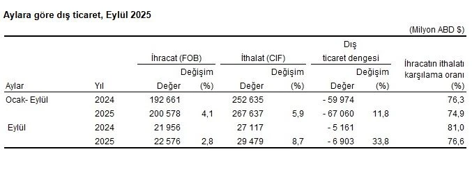 <div>TÜİK, Eylül 2025 dönemine ilişkin dış ticaret istatistiklerini açıkladı. Buna göre; ihracat 2025 yılı eylül ayında, bir önceki yılın aynı ayına göre yüzde 2,8 artarak 22 milyar 576 milyon dolar, ithalat yüzde 8,7 artarak 29 milyar 479 milyon dolar olarak gerçekleşti. İhracat 2025 yılı Ocak-Eylül döneminde bir önceki yılın aynı dönemine göre yüzde 4,1 artarak 200 milyar 578 milyon dolar, ithalat yüzde 5,9 artarak 267 milyar 637 milyon dolar olarak gerçekleşti.</div> <h3>DIŞ TİCARET AÇIĞI ARTTI</h3> <div>Eylül ayında dış ticaret açığı bir önceki yılın aynı ayına göre yüzde 33,8 artarak 5 milyar 161 milyon dolardan, 6 milyar 903 milyon dolara yükseldi. İhracatın ithalatı karşılama oranı 2024 Eylül ayında yüzde 81 iken, 2025 Eylül ayında yüzde 76,6'ya geriledi. Ocak-eylül döneminde dış ticaret açığı yüzde 11,8 artarak 59 milyar 974 milyon dolardan, 67 milyar 60 milyon dolara yükseldi. İhracatın ithalatı karşılama oranı 2024 Ocak-Eylül döneminde yüzde 76,3 iken, 2025 yılının aynı döneminde yüzde 74,9'a geriledi.</div> <h3>EN FAZLA İHRACAT YAPILAN ÜLKE ALMANYA</h3> <div>Eylül ayında ihracatta ilk sırayı Almanya aldı. Almanya'ya yapılan ihracat 1 milyar 904 milyon dolar olurken, bu ülkeyi sırasıyla; 1 milyar 387 milyon dolar ile Birleşik Krallık, 1 milyar 348 milyon dolar ile ABD, 1 milyar 101 milyon dolar ile Irak, 1 milyon 100 milyon dolar ile İtalya takip etti. İlk 5 ülkeye yapılan ihracat, toplam ihracatın yüzde 30,3'ünü oluşturdu. Ocak-eylül döneminde de ihracatta ilk sırayı Almanya aldı. Almanya'ya yapılan ihracat 16 milyar 552 milyon dolar olurken, bu ülkeyi sırasıyla; 12 milyar 392 milyon dolar ile Birleşik Krallık, 12 milyar 19 milyon dolar ile ABD, 9 milyar 835 milyon dolar ile İtalya ve 8 milyar 674 milyon dolar ile Irak takip etti. İlk 5 ülkeye yapılan ihracat, toplam ihracatın yüzde 29,7'sini oluşturdu.</div> <h3>İTHALATTA İLK SIRAYI ÇİN ALDI</h3> <div>İthalatta Çin ilk sırayı aldı. Eylül ayında Çin'den yapılan ithalat 4 milyar 264 milyon dolar olurken, bu ülkeyi sırasıyla; 3 milyar 247 milyon dolar ile Rusya Federasyonu, 2 milyar 363 milyon dolar ile Almanya, 1 milyar 485 milyon dolar ile Birleşik Arap Emirlikleri, 1 milyar 465 milyon dolar ile ABD izledi. İlk 5 ülkeden yapılan ithalat, toplam ithalatın yüzde 43,5'ini oluşturdu. Ocak-eylül döneminde de ithalatta ilk sırayı Çin aldı. Çin'den yapılan ithalat 36 milyar 754 milyon dolar olurken, bu ülkeyi sırasıyla; 31 milyar 801 milyon dolar ile Rusya Federasyonu, 22 milyar 273 milyon dolar ile Almanya, 12 milyar 742 milyon dolar ile ABD, 11 milyar 687 milyon dolar ile İtalya izledi. İlk 5 ülkeden yapılan ithalat, toplam ithalatın yüzde 43,1'ini oluşturdu.</div> <div>(DHA)</div>