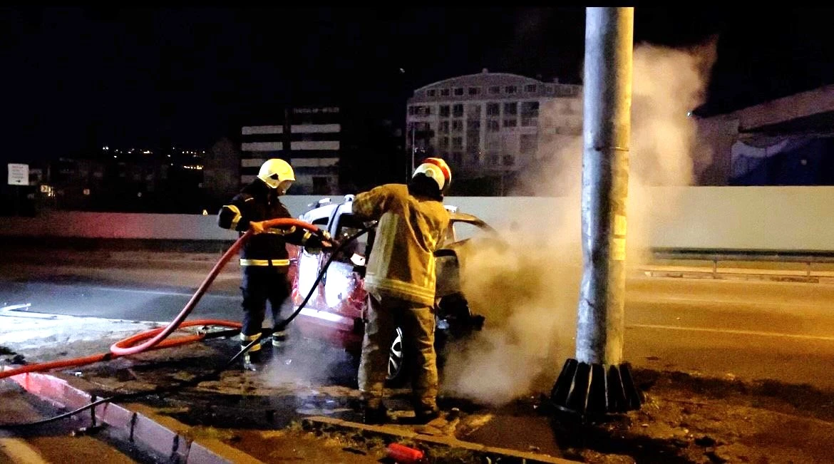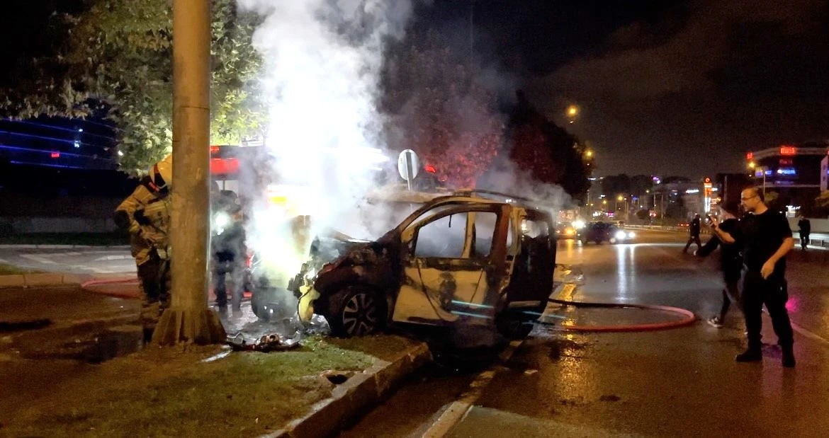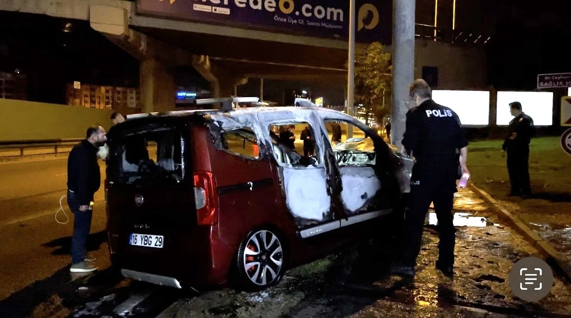 Bursa’da yol ayrımını karıştıran ticari araç sürücüsü refüjdeki direğe çarptı. Kazanın etkisiyle sürücü araçtan fırlarken, dumanların yükseldiği araç alev alev yandı.