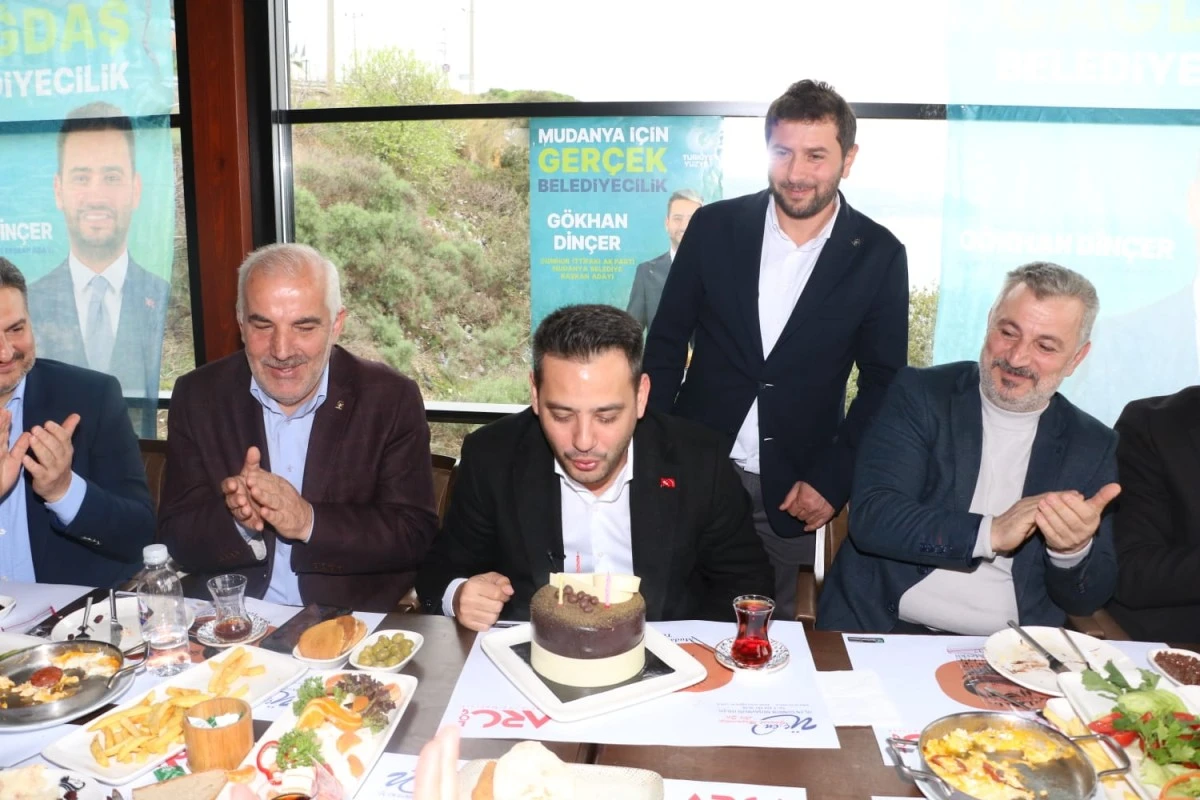 Mudanya'da yaşayan Dağlı vatandaşlarla bir araya gelen Cumhur İttifakı AK Parti Mudanya Belediye Başkan Adayı Gökhan Dinçer, vatandaşların yoğun ilgisiyle karşılaştı. Bu arada seçim çalışmaları nedeniyle Gökhan Dinçer'e eşi Özlem Dinçer ve oğlu Burak Dinçer seçim ofisinde doğum günü sürprizi yaparken, bir araya geldiği AK Parti il ile ilçe mevcut ve eski gençlik kolları başkanları ile antrenmanlarını izlemeye gittiği Bursa Büyükşehir Belediyespor Kulübü Hentbol sporcuları doğum günü pastası keserek Dinçer'in yeni yaşını kutladılar.