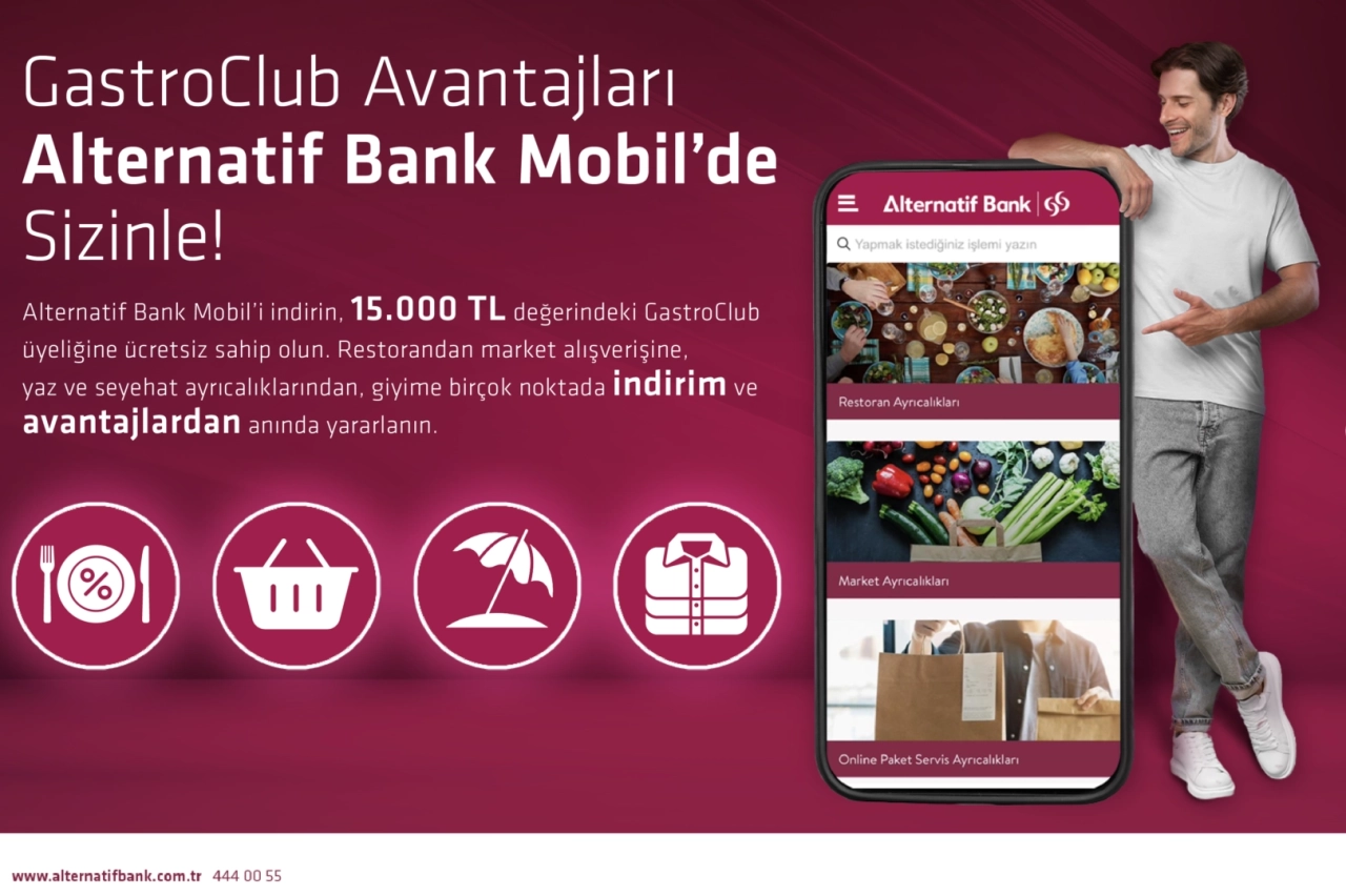Alternatif Bank müşterileri, GastroClub'a üye olduktan sonra yeme içmeden alışverişe, seyahatten dekorasyona, aksesuardan teknolojiye kadar binlerce mağazanın geniş bir yelpazede sunduğu avantajlardan yararlanabiliyor. Alternatif Bank Mobil uygulaması üzerinden sadece birkaç adımda GastroClub üyeliği başlatan müşteriler, Türkiye genelindeki 300'den fazla restoran ve kafede indirim ve fırsatlardan faydalanabiliyor. Yaz mevsimine özel olarak, Bodrum, Çeşme, Urla gibi popüler tatil destinasyonlarında yer alan seçili restoranlarda geçerli fırsatlarda "Yaz Ayrıcalıkları" kategorisi altında GastroClub üyelerini bekliyor. Bu yaz tatilinde de lezzetli anlar ve ayrıcalıklı deneyimler yaşamak isteyen müşteriler, Alternatif Bank Mobil uygulaması üzerinden tüm detaylara kolaylıkla ulaşabiliyor.