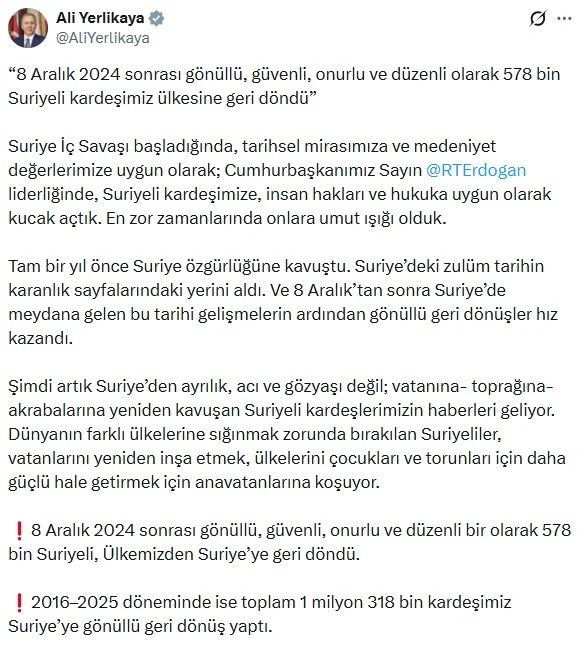 Bakan Yerlikaya, sosyal medya hesabından yaptığı açıklamada, "Suriye iç savaşı başladığında tarihsel mirasımıza ve medeniyet değerlerimize uygun olarak Cumhurbaşkanımız Sayın Recep Tayyip Erdoğan liderliğinde Suriyeli kardeşimize insan hakları ve hukuka uygun olarak kucak açtık. En zor zamanlarında onlara umut ışığı olduk. Tam bir yıl önce Suriye özgürlüğüne kavuştu. Suriye'deki zulüm tarihin karanlık sayfalarındaki yerini aldı. Ve 8 Aralık'tan sonra Suriye'de meydana gelen bu tarihi gelişmelerin ardından gönüllü geri dönüşler hız kazandı. Şimdi artık Suriye'den ayrılık, acı ve gözyaşı değil; vatanına, toprağına, akrabalarına yeniden kavuşan Suriyeli kardeşlerimizin haberleri geliyor. Dünyanın farklı ülkelerine sığınmak zorunda bırakılan Suriyeliler, vatanlarını yeniden inşa etmek, ülkelerini çocukları ve torunları için daha güçlü hale getirmek için ana vatanlarına koşuyor" dedi.