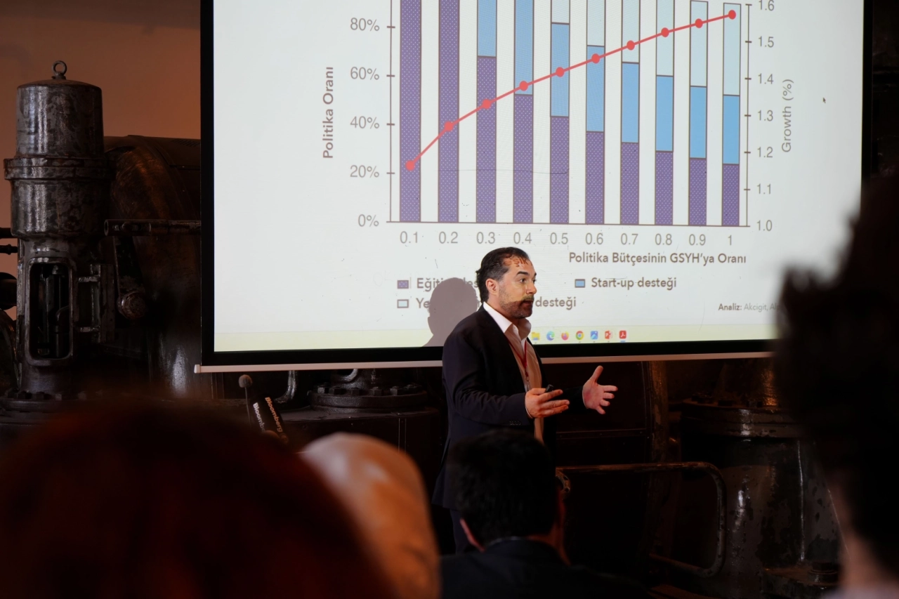 Chicago Üniversitesi’nden Prof. Dr. Ufuk Akçiğit konuşmasında, büyüme ve kalkınma üzerine yaptığı mikro veri temelli araştırmalarını paylaştı. Dünya Bankası’nın 2024 yılı “Orta Gelir Tuzağı” raporuna akademik liderlik eden Akçiğit, konuşmasında ülkelerin ekonomik gelişiminde “orta gelir tuzağı”na nasıl yakalandıklarını ve bundan nasıl çıkabileceklerini değerlendirdi.