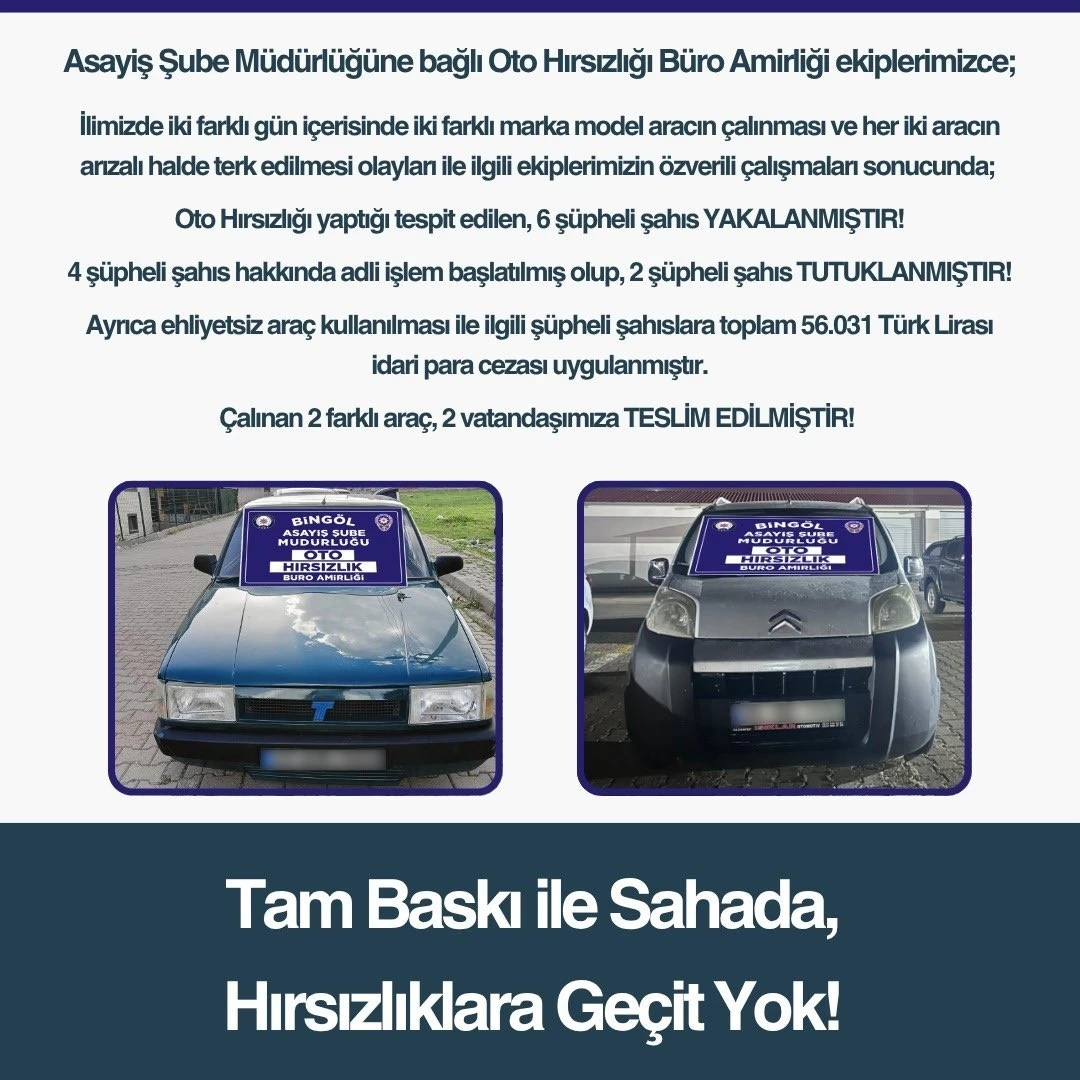 Bingöl Emniyet Müdürlüğü Asayiş Şube Müdürlüğü Oto Hırsızlığı Büro Amirliği ekipleri kentte iki gün içerisinde iki farklı marka aracın çalınması ve her iki aracın arızalı halde terk edilmesi üzerine harekete geçti. Yapılan çalışmada oto hırsızlığı yaptığı değerlendirilen 6 şüpheli yakalandı. 4 şüpheli hakkında adli işlem başlatılırken 2 şahıs, çıkarıldıkları mahkemece tutuklanarak cezaevine gönderildi. Ayrıca şüphelilere ehliyetsiz araç kullanmaktan toplam 56 bin 31 lira idari para cezası uygulandı. Çalınan araçlar vatandaşlara teslim edildi.