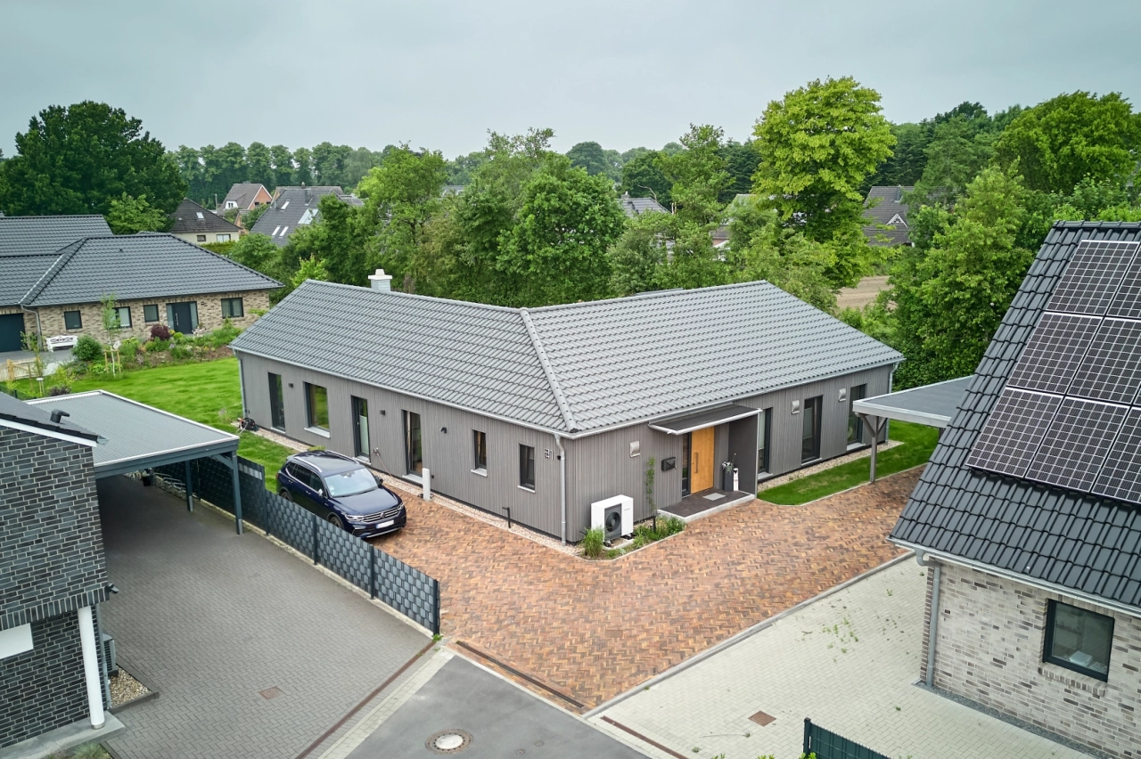 Almanya’nın kuzeyindeki klasik tuğla mimarisiyle çevrili bir yerleşim alanında yükselen tek katlı ahşap bungalov, bu anlayışın güçlü bir örneğini oluşturuyor. Christoph ve Svea Stanek çifti ile oğulları Pius için tasarlanan bu müstakil ev, çağdaş ahşap mimarinin kuzey Almanya’da da ne kadar etkileyici olabileceğini gözler önüne seriyor.