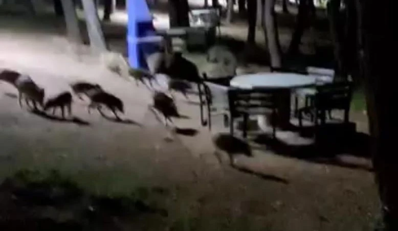 Ormanda yürüyüş yapan vatandaşlar, bir anda karşılarına çıkan yaban domuzu sürüsüyle büyük hayrete düştü. Kalabalık şekilde hareket eden domuzlar, kısa süre sonra kayıplara karıştı.