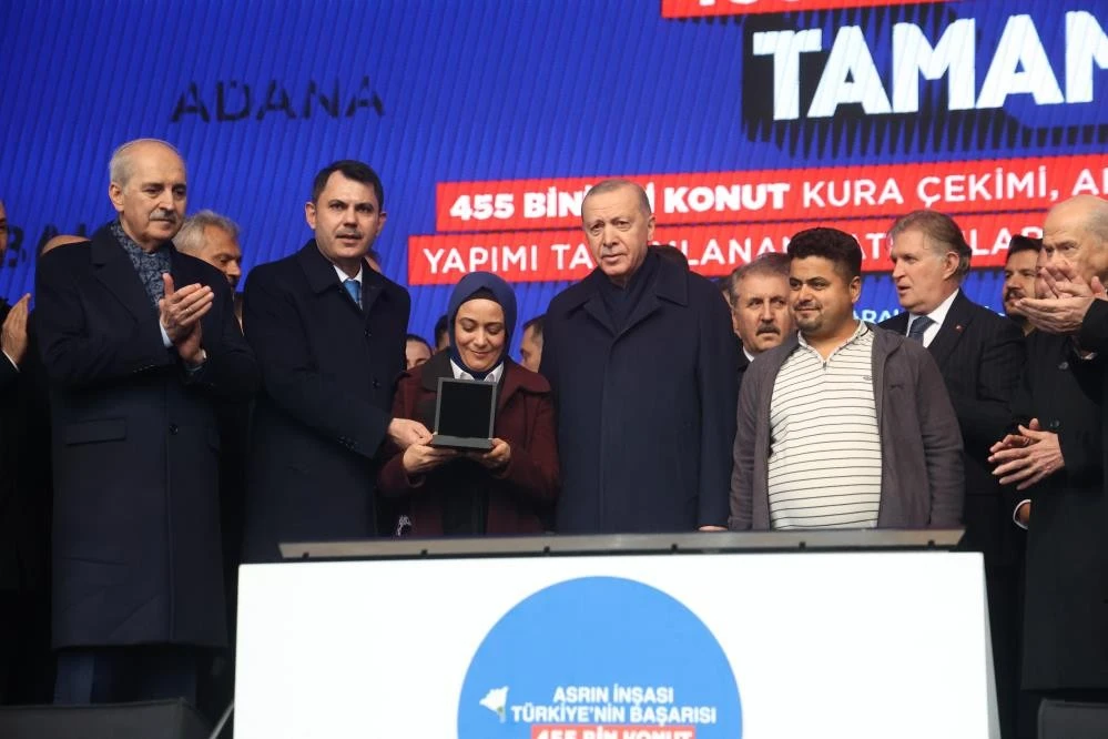 Cumhurbaşkanı Recep Tayyip Erdoğan 455 bininci konutu teslim etmenin gururunu yaşadıklarını ifade ederek, "İşte bugün dünyada hemen hiçbir ülkenin altından kalkamayacağı büyük bir başarıya Hatay'ımızda bizzat tanıklık ediyoruz. Depremin vurduğu on bir ilimizde yapımı tamamlanan 455 bininci afet konutumuzu hak sahibi kardeşlerimize teslim etmenin gururunu yaşıyoruz. Bu yuvalarda yepyeni bir hayatın sayfasını açacak tüm vatandaşlarımıza hayırlı, uğurlu olsun diyor, hanelerine kavuşan her bir kardeşime sağlıklı, mutlu, bereketli ömürler diliyorum. Rabb'im bu evlerde inşallah ağız tadıyla oturmayı nasip eylesin" şeklinde konuştu.