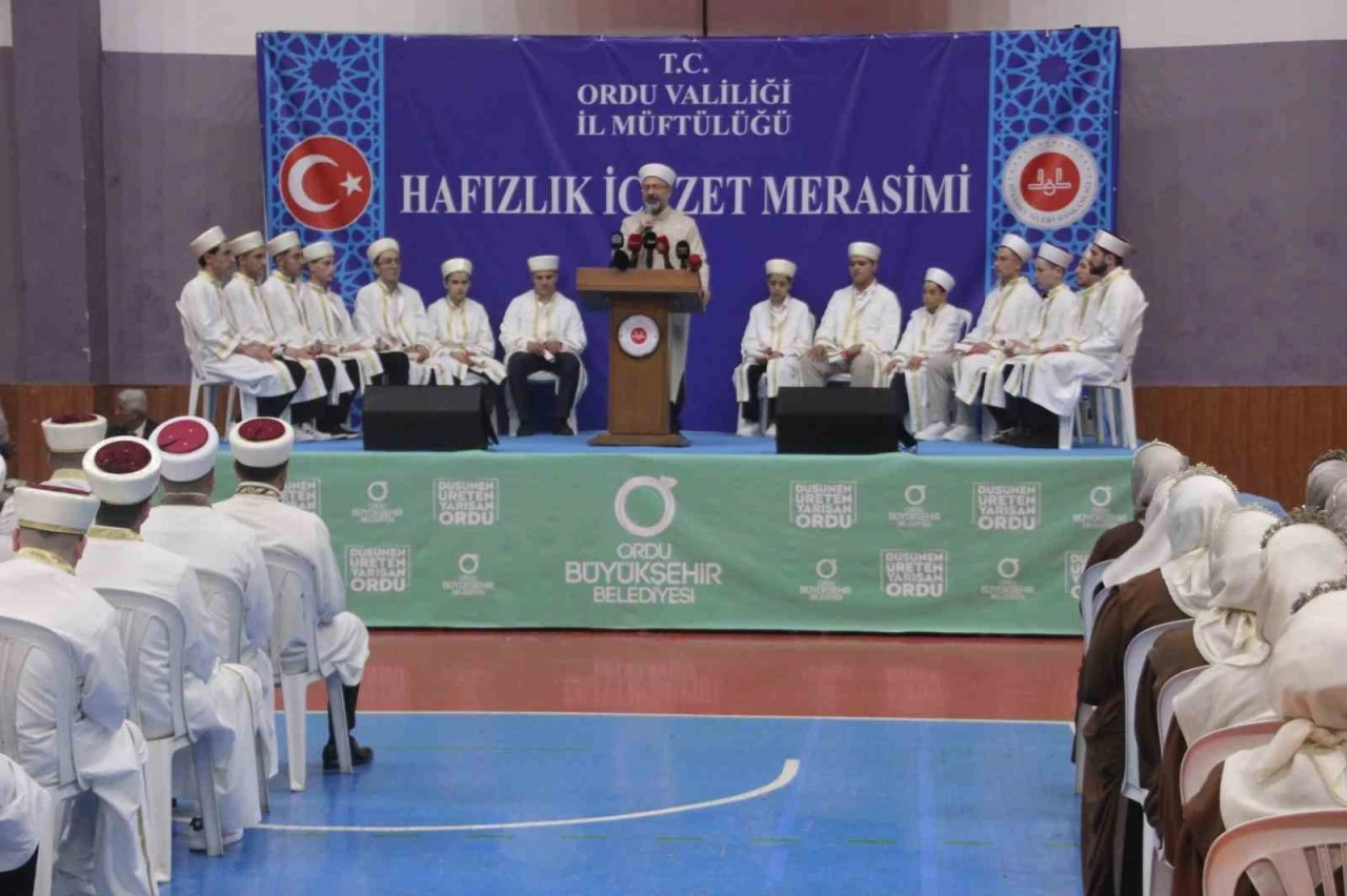 "Kanunun Diyanet İşleri Başkanlığı olarak bize görev, toplumu din konusunda aydınlatmak. İnanç, ibadet, ahlak gibi konularda doğru bilgi ile toplumu donatmak. Sizlerden bunu bekliyoruz. Zaten Rabb’imizin de bizim için yapmış olduğu görev tanımına baktığımız zaman şöyle buyuruyor: ‘İçinizden hayra çağıran, iyiliği emreden kötülükten men eden bir topluluk bulunsun. İşte kurtuluşa erecek olan onlardır. Sizler, bu ayeti kerimede anlatıldığı gibi inşallah ömrünüz boyunca hayra çağıracaksınız, insanları iyiliğe davet edeceksiniz." Kur’an-ı Kerim tilavetinin ardından icazet belgesi alacak hafızlar da çeşitli sureler okudu. Diyanet İşleri Başkanı Prof. Dr. Ali Erbaş, Ordu Valisi Muammer Erol, Ordu Büyükşehir Belediye Başkanı Dr. Mehmet Hilmi Güler ve diğer protokol üyeleri tarafından hafızlara icazet belgesinin verildiği törene ayrıca, İl Emniyet Müdürü Ahmet Acar, İl Jandarma Komutanı Kıdemli Albay Sadi Akman, Ordu Üniversitesi Rektör Yardımcısı Prof. Dr. Hakan Timur, İl Müftüsü Dr. İsmail Çiçek, ilçe kaymakamları, ilçe belediye başkanları ve hafızların aileleri katıldı.