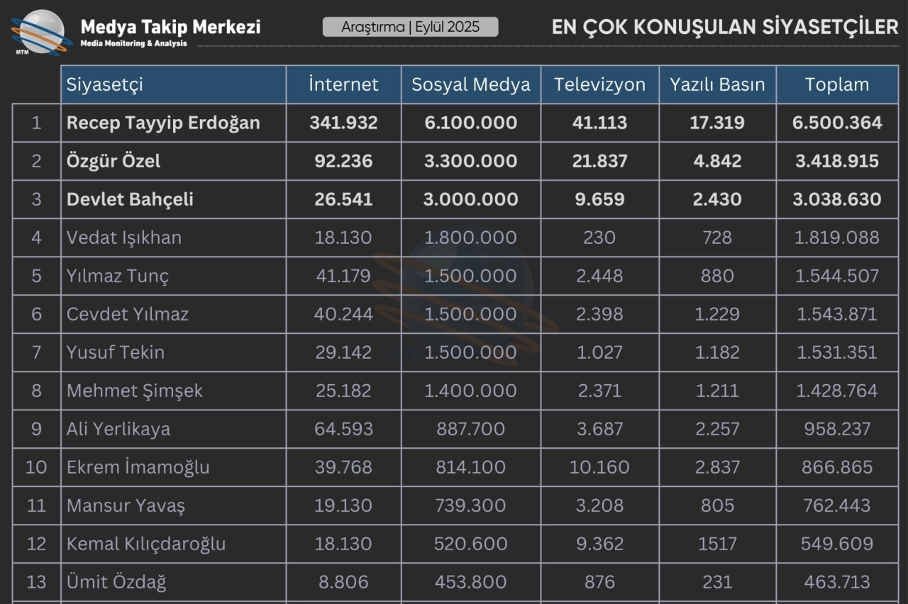 MTM Medya Takip Merkezi, Eylül 2025’te medya ve sosyal medyada en çok konuşulan siyasetçileri belirledi.