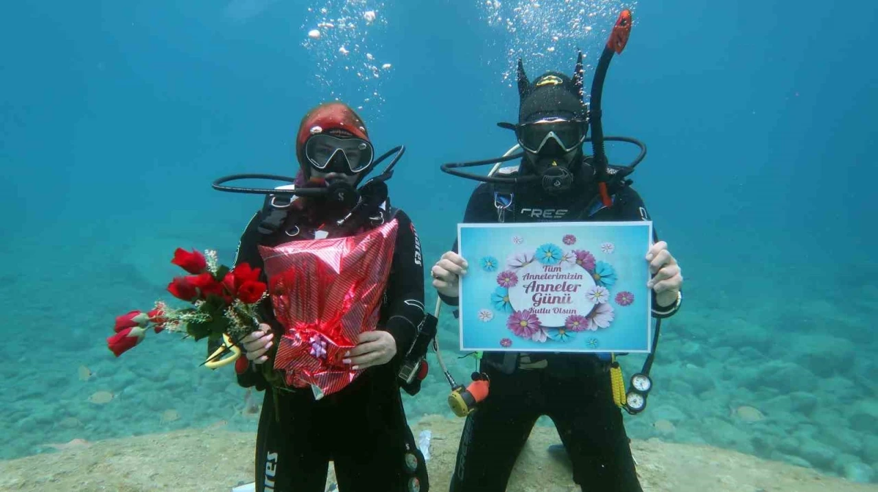 Muğla’nın Fethiye ilçesinde denizde 5 metre derinliğe dalan dalgıçlar, tüm annelerin Anneler Günü’nü hazırladıkları mizansen ile kutladı.