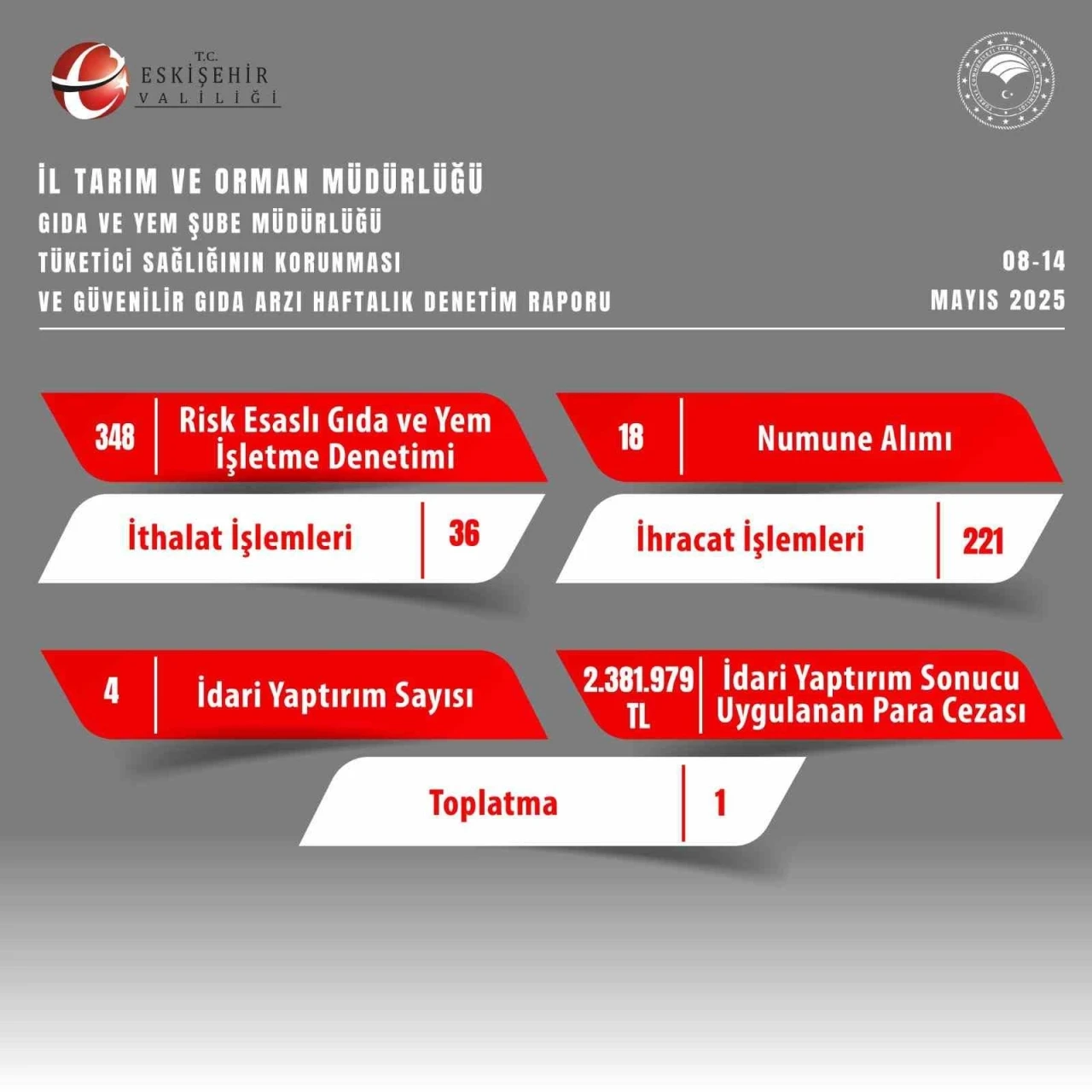Eskişehir Valiliği, İl Tarım ve Orman Müdürlüğü Gıda ve Yem Müdürlüğü ekiplerince 8-14 Mayıs 2025 tarihleri arasında yapılan çalışmalarla ilgili verileri paylaştı. Tüketici sağlığının korunması ve güvenilir gıda arzı haftalık denetim raporunda yer alan bilgilere göre; 348 risk esaslı gıda ve yem işletme denetimi, 36 ithalat işlemleri, 18 numune alımı ile 221 ihracat işlemleri gerçekleştirildi. Ekiplerin çalışmaları sonucunda, 4 idari yaptırım ve 2 milyon 381 bin 979 TL para cezası uygulanırken, 1 toplatma kararı alındığı belirtildi.