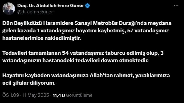 İstanbul İl Sağlık Müdürü Doç. Dr. Abdullah Emre Güner, sosyal medya hesabından Beylikdüzü’nde yaşanan metrobüs kazasına ilişkin açıklamalarda bulundu. Güner, "Dün Beylikdüzü Haramidere Sanayi Metrobüs Durağı’nda meydana gelen kazada 1 vatandaşımız hayatını kaybetmiş, 57 vatandaşımız hastanelerimize nakledilmiştir. Tedavileri tamamlanan 54 vatandaşımız taburcu edilmiş olup, 3 vatandaşımızın hastanedeki tedavileri devam etmektedir. Hayatını kaybeden vatandaşımıza Allah’tan rahmet, yaralılarımıza acil şifalar diliyorum" ifadelerini kullandı.