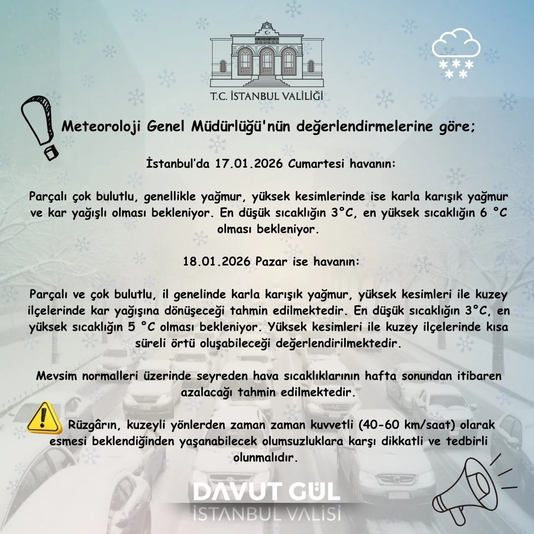 İstanbul Valiliği, hafta sonu kent genelinde karla karışık yağmur ve kar yağışının etkili olmasının beklendiğini belirterek, yaşanabilecek olumsuzluklara karşı dikkatli ve tedbirli olmaları konusunda uyarıda bulundu.