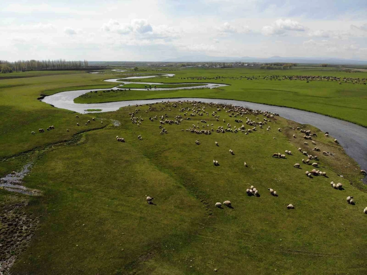 Öte yandan, bahar ayın ile birlikte yeşeren meralara yayılan hayvanlar, kameralara yansıdı. Büyük ve küçükbaş hayvan sürülerini yeşeren meralara çıkararak otlatmaya başladı. Arpaçay çayının etrafında yayılan hayvanlar renkli görüntüler ortaya çıkardı.