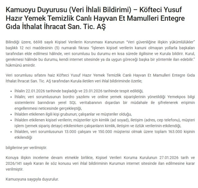 Kişisel Verileri Koruma Kurumu (KVKK), Köfteci Yusuf Hazır Yemek Temizlik Canlı Hayvan Et Mamulleri Entegre Gıda İthalat İhracat San. Tic. AŞ'ye ait bilgi sistemlerinde yaşanan veri ihlaline ilişkin kamuoyunu bilgilendirdi.
