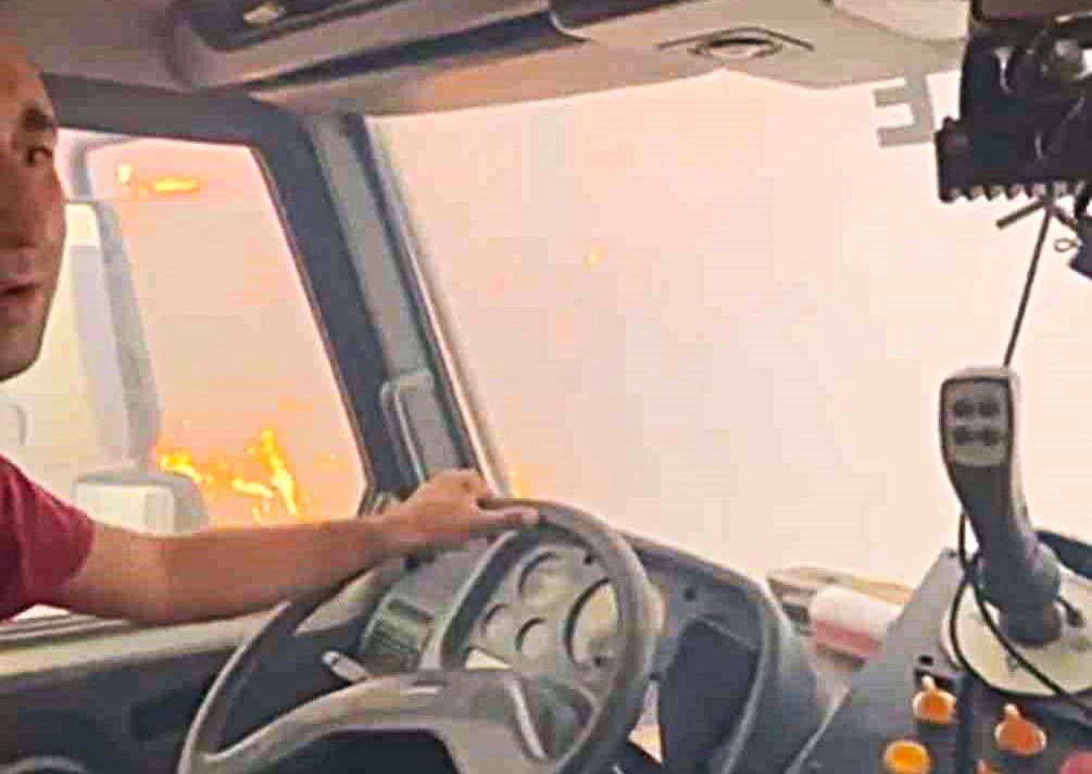 Çanakkale’nin Ezine ilçesinde çıkan orman yangınına Orman Bölge Müdürlüğü ekipleri havadan ve karadan müdahale ediyor. Bu sırada alevlerin arasında kalan bir arazözdeki orman işçileri, o zor anları cep telefonu kameralarıyla kaydetti.