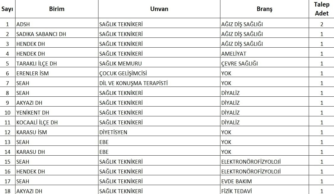 Sağlık Bakanlığı, merkez ve taşra teşkilatında görevlendirilmek üzere 15 bin 342 sözleşmeli personel ve 3 bin 658 işçi alımı gerçekleştirecek. Sağlık Bakanı Prof. Dr. Kemal Memişoğlu sosyal medya üzerinden yaptığı, "KPSS sonuçlarına göre ÖSYM tarafından yapılacak merkezi yerleştirme ile toplam 15 bin 342 personel alımı gerçekleştirilecektir" açıklama ile personel alımını gerçekleştirileceğini duyurdu. Bu çerçevede Sağlık Bakanlığı personel alımı branş dağılımı yayımlanan kılavuz ile birlikte belli oldu. Sakarya’da 215 personelin alınacağı branşlar arasında sağlık teknikeri, sağlık memuru, çocuk gelişimcisi, dil ve konuşma terapisti, diyetisyen, ebe, fizyoterapist, hemşire, sağlık fizikçisi, temizlik hizmetleri, bakım onarım teknik destek kadroları yer aldı. Sakarya’ya atanacak olan 215 personel; Sakarya İl Sağlık Müdürlüğü, Sakarya Eğitim ve Araştırma Hastanesi, Yenikent Devlet Hastanesi, Sadıka Sabancı Devlet Hastanesi, Ağız ve Diş Sağlığı Hastanesi, Hendek Devlet Hastanesi, Taraklı İlçe Devlet Hastanesi, Kocaali İlçe Devlet Hastanesi, Karasu Devlet Hastanesi, Pamukova Devlet Hastanesi, Akyazı Devlet Hastanesi, Kaynarca İlçe Devlet Hastanesi. Ferizli İlçe Devlet Hastanesi, Sapanca İlçe Devlet Hastanesi, Halk Sağlığı Laboratuvarı ve sağlık ocaklarında görev yapacak.