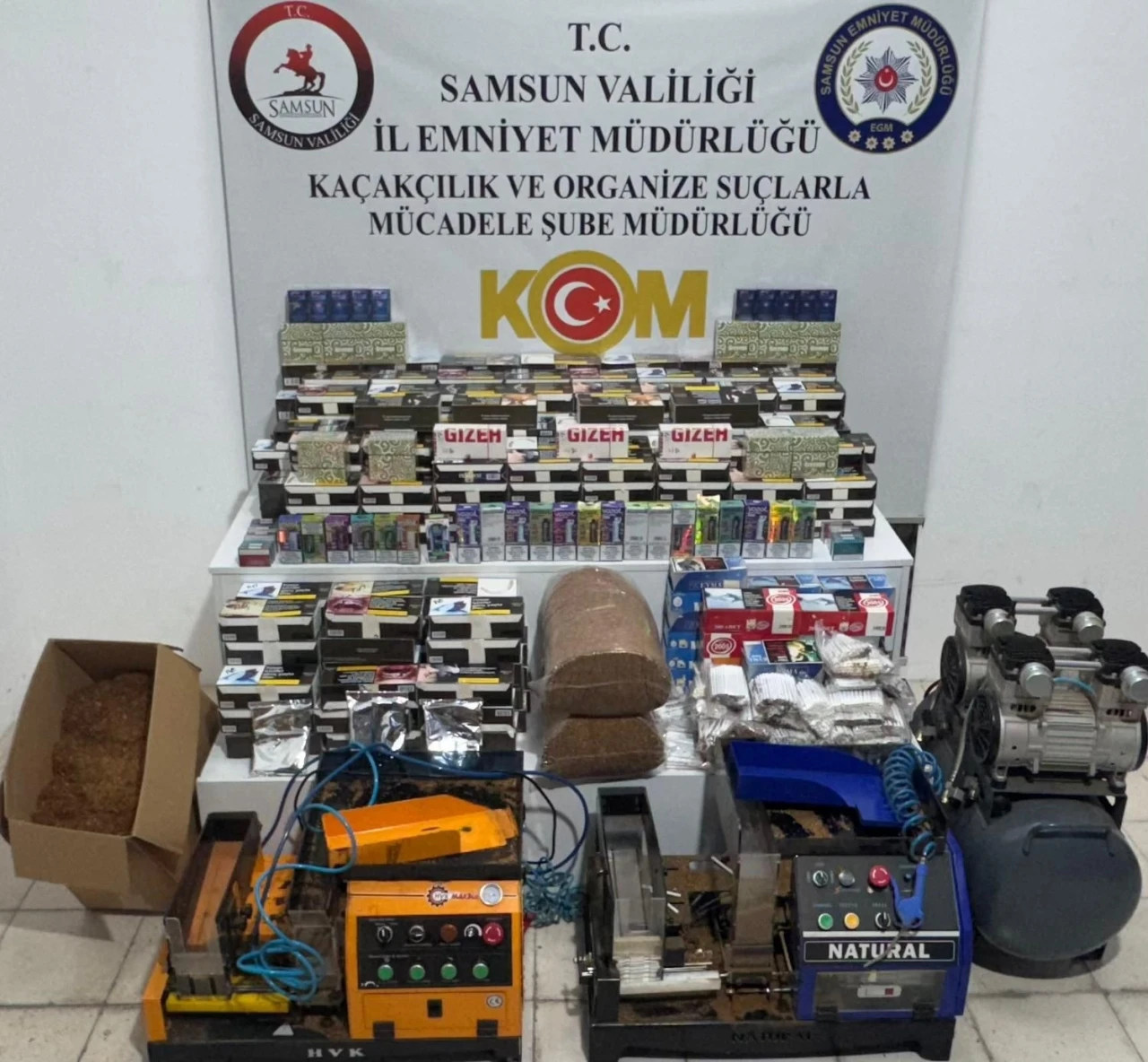 Edinilen bilgiye göre, İl Emniyet Müdürlüğü Kaçakçılık ve Organize Suçlarla Mücadele (KOM) ile Narkotik Suçlarla Mücadele (NSM) Şube Müdürlüklerince, kaçakçılıkla mücadele kapsamında Atakum ve İlkadım ilçelerinde operasyon düzenledi. Yapılan çalışmalarda, 2 adet otomatik elektrikli sigara sarma makinesi, 1 adet kompresör, 48 bin 500 adet makaron sigara, 24 bin 800 adet kaçak makaron, 14 bin 160 adet kaçak sigara sarma kağıdı, 40 paket gümrük kaçağı sigara, 23 adet gümrük kaçağı elektronik sigara, 25 kilo kaçak tütün ve 1,5 kilo gümrük kaçağı nargile tütünü ele geçirildi. Operasyon kapsamında 4 şahıs yakalanarak haklarında adli işlem başlatıldı.