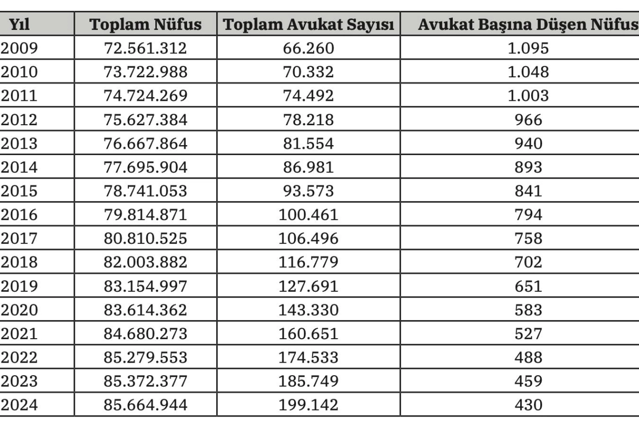 Raporda en çarpıcı bulgulardan biri avukat sayısındaki artış oldu. Türkiye'de 1998 yılında 36 bin olan avukat sayısı, 2024 itibarıyla 199 bini aştı. Böylece avukat sayısı 26 yılda beş katına çıktı. Avukat başına düşen nüfus ise son 15 yılda bin 95 kişiden 430 kişiye kadar gerileyerek Avrupa ortalamasının altına indi.
