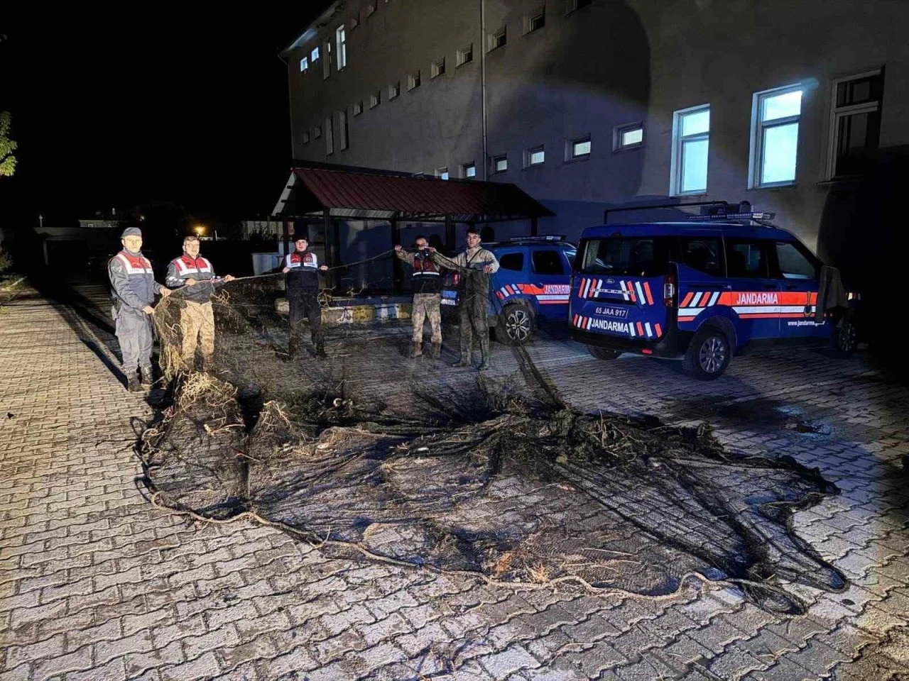Van’ın Muradiye ilçesinde ekiplerin yaptıkları denetimlerde 1 ton canlı inci kefali ile 100 metre uzunluğunda manyat ağı ele geçirildi.