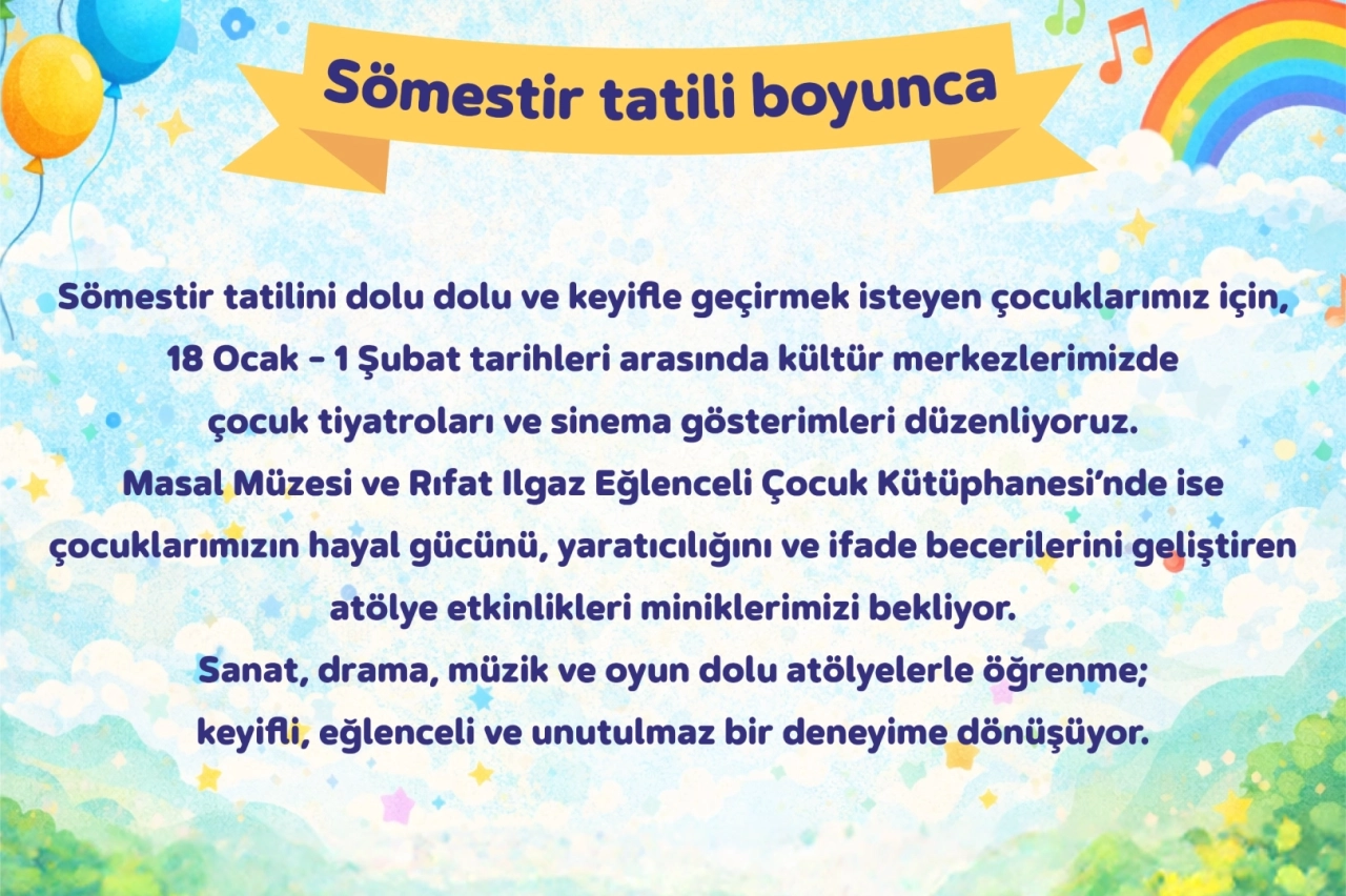 Kartal Belediyesi, yarıyıl tatili dolayısıyla 19 Ocak-01 Şubat 2026 tarihleri arasında kültür merkezlerinde düzenlenecek çeşitli etkinlikler ile çocuklara eğlenceli vakit geçirebilecekleri dolu dolu bir "Yarıyıl Şenliği" programı hazırladı.