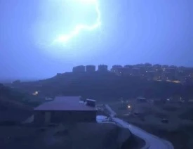 Bu esnada ilçenin dört bir yanında çakan şimşekler kameralara yansıyarak görsel şölen sundu