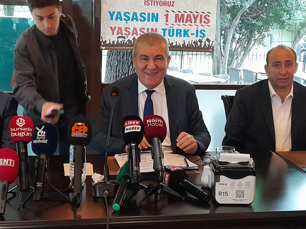 Merinos Park’da Gönül Dostları’nda düzenlenen basın toplantısında Türk-İş 8. Bölge Temsilcisi Ruhi Biçer bu yıl Türk-İş’in 1 Mayıs kutlamasını Bursa’da gerçekleştirme kararı aldığını açıkladı: