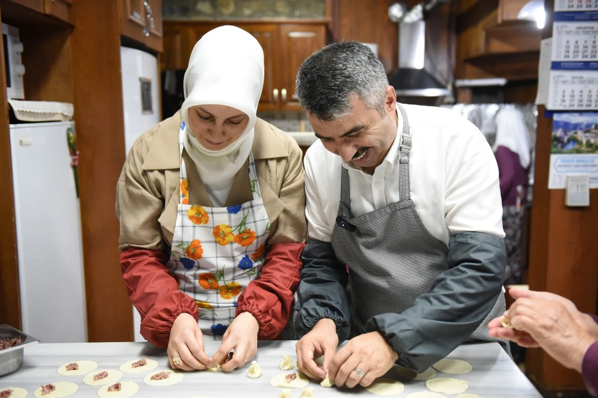 Başkan Yılmaz Eşi Esin Yılmaz ile kooperatif binasının atölyesine girerek Zeyniler Hıngalı yapımına katkı sundu, ayrıca aşure kazanının da başına geçti...